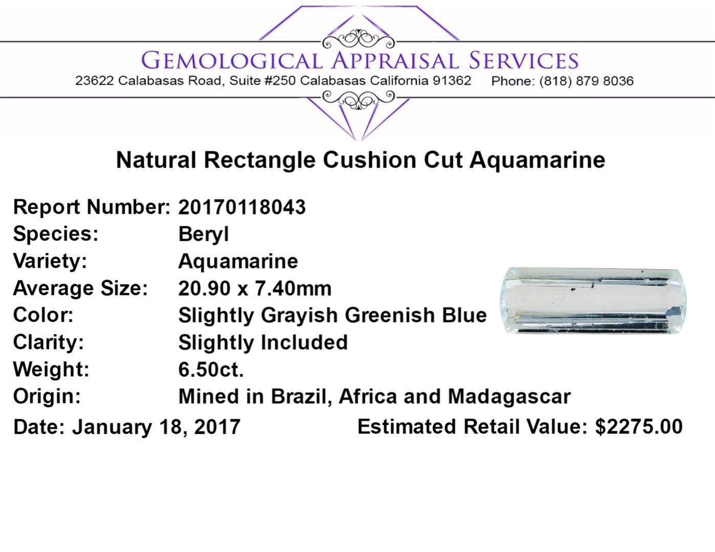 One natural rectangle cushion cut aquamarine with an exact weight of 6.50ct., clarity is slightly included, slightly grayish greenish blue. Gemological Appraisals Services estimates the retail value at $2275 GAS Appraised.