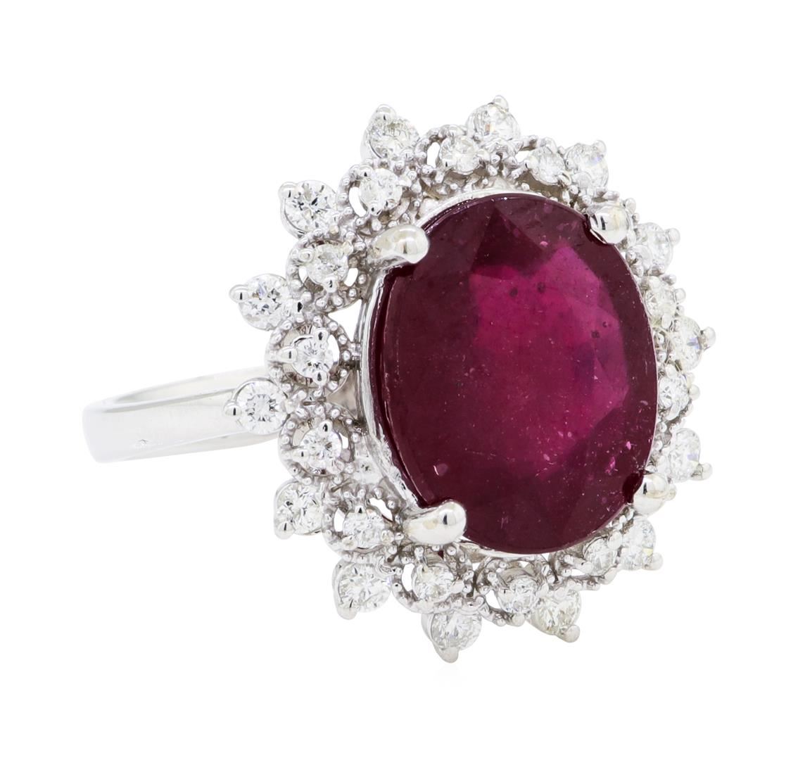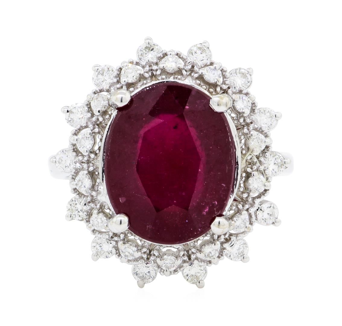 One electronically tested 14KT white gold lady's combination cast & assembled fashion ring with a double basket halo with a bright polish with milgrain detailing finish. The featured lady's ring has a shank measuring 2.70 millimeters wide. Identified with markings of '14K'. Condition is new, good workmanship. Containing: One prong set oval modified mixed cut natural ruby, measuring 12.75 x 10.24 x 5.34mm, (depth est.) 5%. bulge factor, approximate weight of 6.50ct., clarity is heavily included, medium dark, moderately strong, slightly purplish red color, (GIA slpR 6/4), cut is good. Transmitting light somewhat diffusely, semi-transparent to translucent. Naturally occurring internal & external characteristics are present. Indications of laboratory high temperature heat treatment, with glass & flux additives. Colored gemstones are presumed to have been subjected to commonly used enhancement processes. Graded in the setting. Fourteen prong set round brilliant cut diamonds, measuring 2.00 - 1.90 x 1.21mm (depth est.) approximate total weight of 14 Stones = 0.40ct. Graded in the setting. Color H - I Clarity SI-2 to I-1 Cut Good Fourteen prong set round brilliant cut diamonds, measuring 1.80 - 1.70 x 1.09mm (depth est.) approximate total weight of 14 Stones = 0.30ct. Graded in the setting. Color H - I Clarity SI-2 to I-1 Cut Good. Total Weight of Colored Stones 6.50ct.. Total Weight of Diamonds 0.70ct.. Total Weight of Ring 6.20gm GAS Appraised at $4765.00. GAS Appraised at $11,540.00.