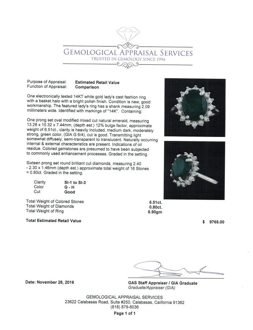 One electronically tested 14KT white gold lady's cast fashion ring with a basket halo with a bright polish finish. The featured lady's ring has a shank measuring 2.09 millimeters wide. Identified with markings of '14K'. Condition is new, good workmanship. Containing: One prong set oval modified mixed cut natural emerald, measuring 13.28 x 10.32 x 7.44mm, (depth est.) 12%. bulge factor, approximate weight of 6.51ct., clarity is heavily included, medium dark, moderately strong, green color, (GIA G 6/4), cut is good. Transmitting light somewhat diffusely, semi-transparent to translucent. Naturally occurring internal & external characteristics are present. Indications of oil residue. Colored gemstones are presumed to have been subjected to commonly used enhancement processes. Graded in the setting. Sixteen prong set round brilliant cut diamonds, measuring 2.40 - 2.30 x 1.46mm (depth est.) approximate total weight of 16 Stones = 0.80ct. Graded in the setting. Clarity SI-1 to SI-3. Color: G - H Cut Good. Total Weight of Colored Stones 6.51ct.. Total Weight of Diamonds 0.80ct.. Total Weight of Ring 6.90gm. GAS Appraised at $9,765.00.
