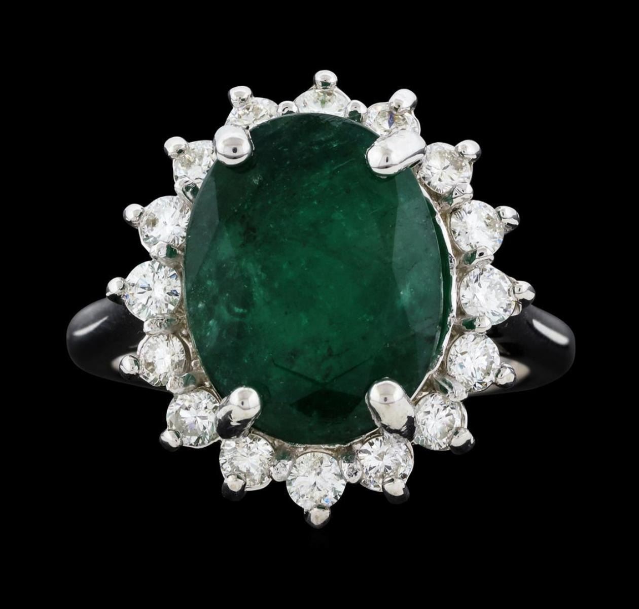 One electronically tested 14KT white gold lady's cast fashion ring with a basket halo with a bright polish finish. The featured lady's ring has a shank measuring 2.09 millimeters wide. Identified with markings of '14K'. Condition is new, good workmanship. Containing: One prong set oval modified mixed cut natural emerald, measuring 13.28 x 10.32 x 7.44mm, (depth est.) 12%. bulge factor, approximate weight of 6.51ct., clarity is heavily included, medium dark, moderately strong, green color, (GIA G 6/4), cut is good. Transmitting light somewhat diffusely, semi-transparent to translucent. Naturally occurring internal & external characteristics are present. Indications of oil residue. Colored gemstones are presumed to have been subjected to commonly used enhancement processes. Graded in the setting. Sixteen prong set round brilliant cut diamonds, measuring 2.40 - 2.30 x 1.46mm (depth est.) approximate total weight of 16 Stones = 0.80ct. Graded in the setting. Clarity SI-1 to SI-3. Color: G - H Cut Good. Total Weight of Colored Stones 6.51ct.. Total Weight of Diamonds 0.80ct.. Total Weight of Ring 6.90gm. GAS Appraised.