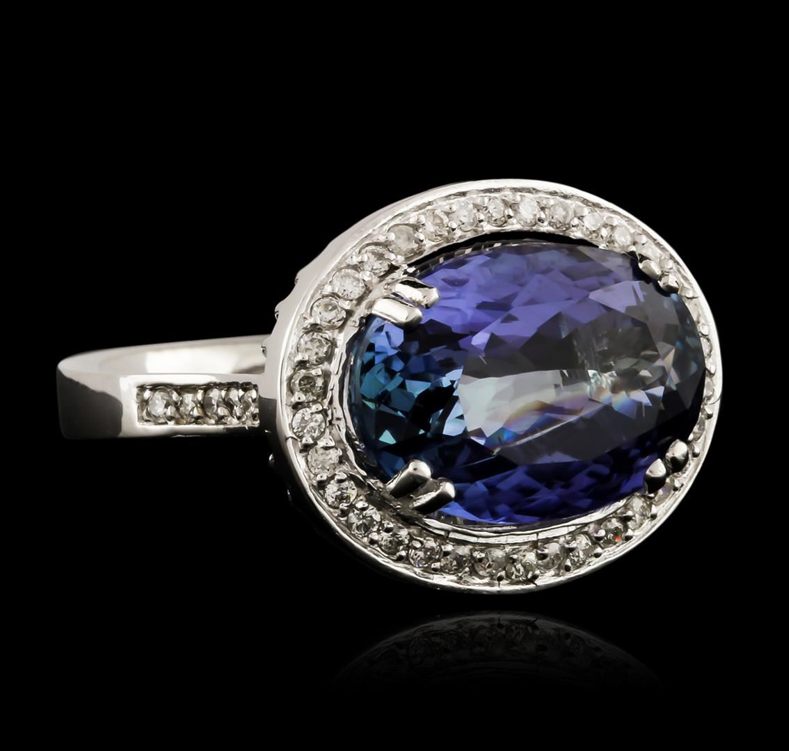 One electronically tested 14KT white gold lady's cast fashion ring with a basket halo with a bright polish finish. The featured lady's ring has a horizontal oval halo and a shank measuring 3.23 millimeters wide. Identified with markings of 'K14'. Condition is new, good workmanship. Containing: One prong set oval modified brilliant cut natural tanzanite, measuring 14.57 x 10.21 x 6.23mm, (depth est.) approximate weight of 6.52ct., clarity is moderately included, medium light, very slightly grayish, violet color, (GIA V 4/3), cut is good. Transmitting light with no distortion, transparent. Colored gemstones are presumed to have been subjected to commonly used enhancement processes. Graded in the setting. Forty-Six prong set round brilliant cut diamonds, measuring 1.35 - 1.30 x 0.80mm (depth est.) approximate total weight of 46 Stones = 0.39ct. Graded in the setting. Clarity SI-2 to I-1. Color: I - J Cut Good. Total Weight of Colored Stones 6.52ct.. Total Weight of Diamonds 0.39ct.. Total Weight of Ring 6.40gm. GAS Appraised at $5,740.00.