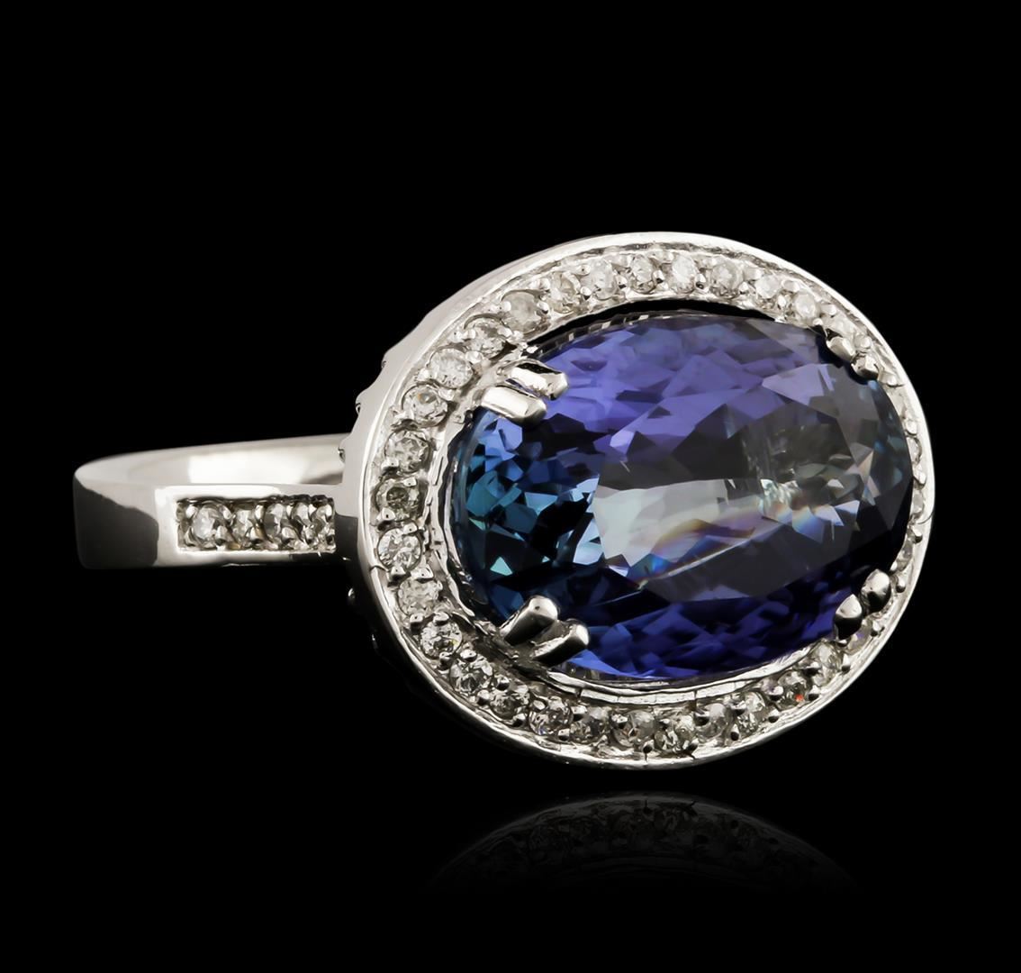 One electronically tested 14KT white gold lady's cast fashion ring with a basket halo with a bright polish finish. The featured lady's ring has a horizontal oval halo and a shank measuring 3.23 millimeters wide. Identified with markings of 'K14'. Condition is new, good workmanship. Containing: One prong set oval modified brilliant cut natural tanzanite, measuring 14.57 x 10.21 x 6.23mm, (depth est.) approximate weight of 6.52ct., clarity is moderately included, medium light, very slightly grayish, violet color, (GIA V 4/3), cut is good. Transmitting light with no distortion, transparent. Colored gemstones are presumed to have been subjected to commonly used enhancement processes. Graded in the setting. Forty-Six prong set round brilliant cut diamonds, measuring 1.35 - 1.30 x 0.80mm (depth est.) approximate total weight of 46 Stones = 0.39ct. Graded in the setting. Clarity SI-2 to I-1. Color: I - J Cut Good. Total Weight of Colored Stones 6.52ct.. Total Weight of Diamonds 0.39ct.. Total Weight of Ring 6.40gm. GAS Appraised.