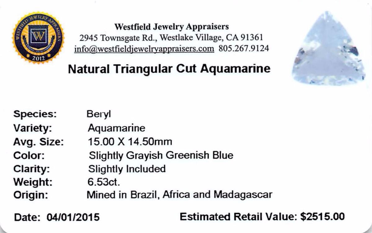 One triangle cut natural aquamarine exact weight 6.53ct., clarity is slightly included, type I, medium, slightly grayish, very slightly greenish blue color, (GIA vslgB 5/2), cut is good. Westfield Appraised at $2,515.00.