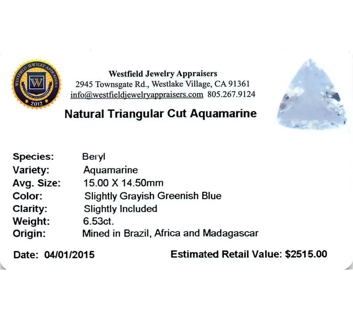 One triangle cut natural aquamarine exact weight 6.53ct., clarity is slightly included, type I, medium, slightly grayish, very slightly greenish blue color, (GIA vslgB 5/2), cut is good. Westfield Appraised at $2,515.00.