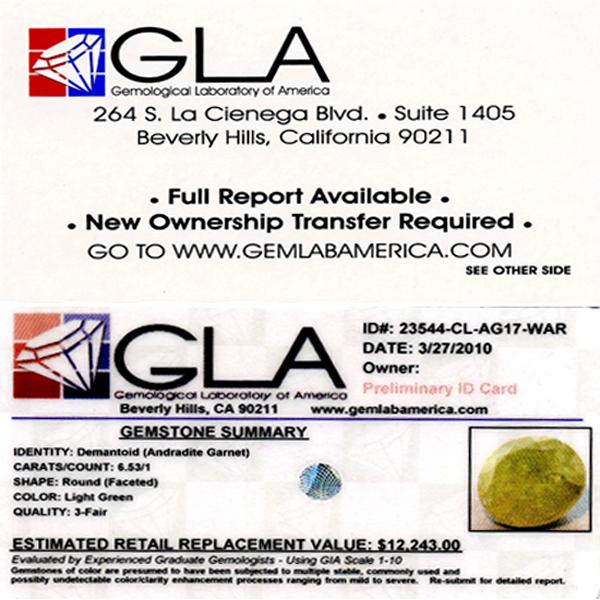 Excellent light green colored specimen round cut; lab quality evaluation 3; treatment as noted; Gem Guide wholesale $2286-$3265; full retail appraisal $12403; full lab evaluation available
