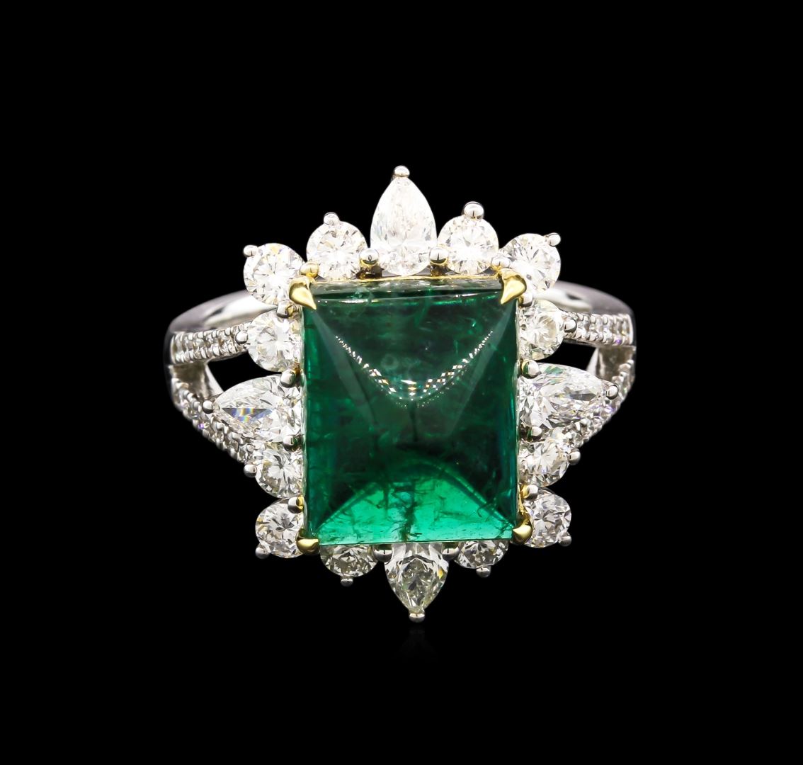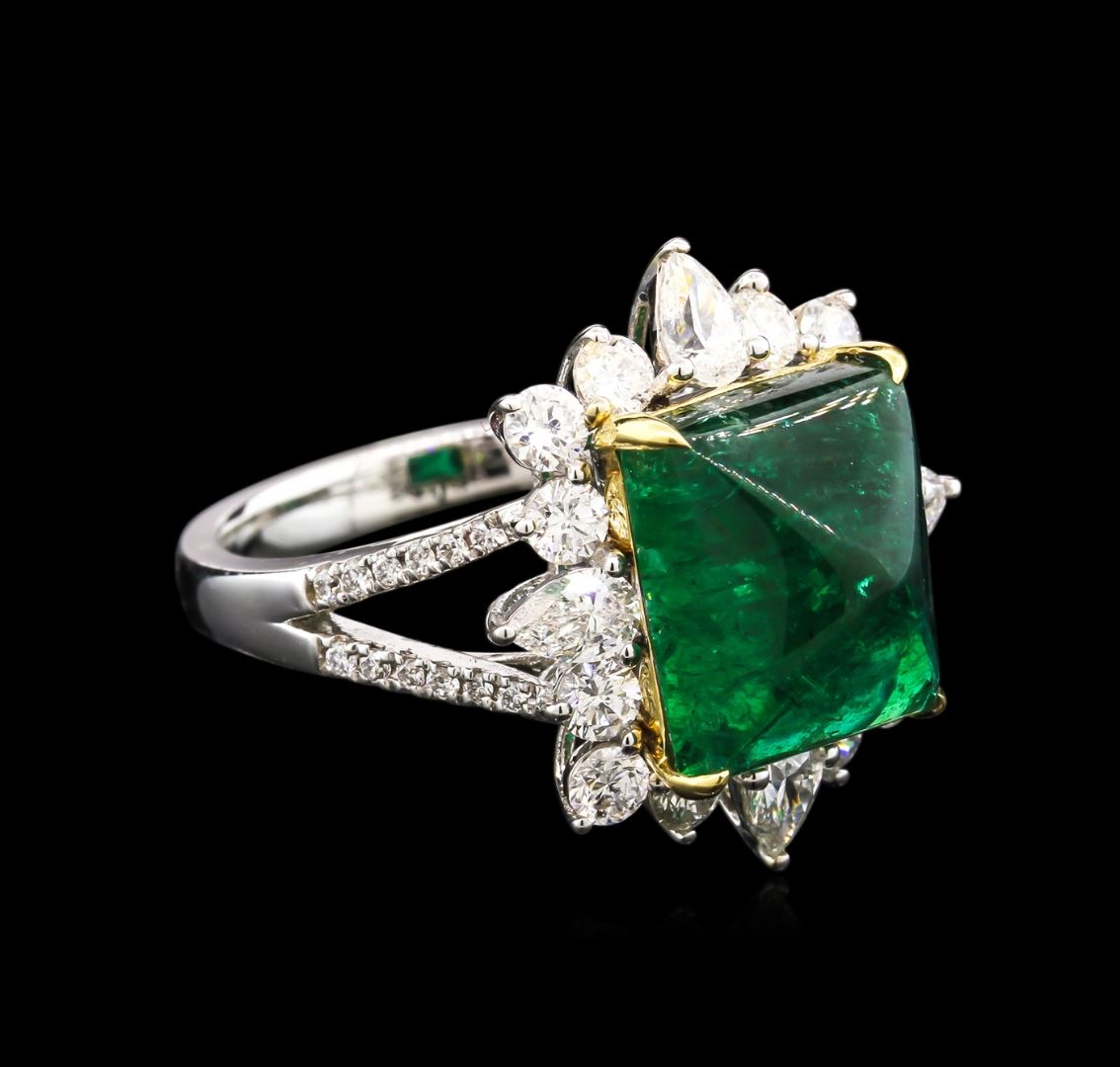 One electronically tested 18KT yellow and white gold lady's combination cast & assembled fashion ring with a split shank with a bright polish finish. Trademark is CJ. Identified with markings of "18K". Condition is new, good workmanship. Containing: One prong set rectangular cabochon cut natural emerald, measuring 11.56 x 9.52 x 7.15mm, 12% bulge factor, approximate weight of 6.53ct., clarity is heavily included, type III, dark, strong, green color, (GIA G 7/5), cut is very good. Transmitting light somewhat diffusely, semi-transparent to translucent. Naturally occurring internal & external characteristics are present. Indications of clarity enhancement. Indications of oil residue. Graded in the setting. Four prong set pear shaped cut diamonds, measuring 4.80 x 3.00 x 1.80mm (depth est.) approximate total weight of 4 Stones = 0.61ct. Graded in the setting. Clarity: VS-2 to SI-1. Color: H - I. Cut Good Twelve prong set round brilliant cut diamonds, measuring 2.80 - 2.70 x 1.65mm (depth est.) approximate total weight of 12 Stones = 0.91ct. Graded in the setting. Clarity: VS-2 to SI-2. Color: H - I. Cut Good Twenty-Four prong set round brilliant cut diamonds, measuring 1.10 - 1.00 x 0.68mm (depth est.) approximate total weight of 24 Stones = 0.11ct. Graded in the setting. Clarity: VS-2 to SI-1. Color: H - I. Cut Good. Total Weight of Colored Stones 6.53ct. Total Weight of Diamonds 1.63ct. Total Weight of Ring 7.40gm. GAS Appraised at $11,780.00.