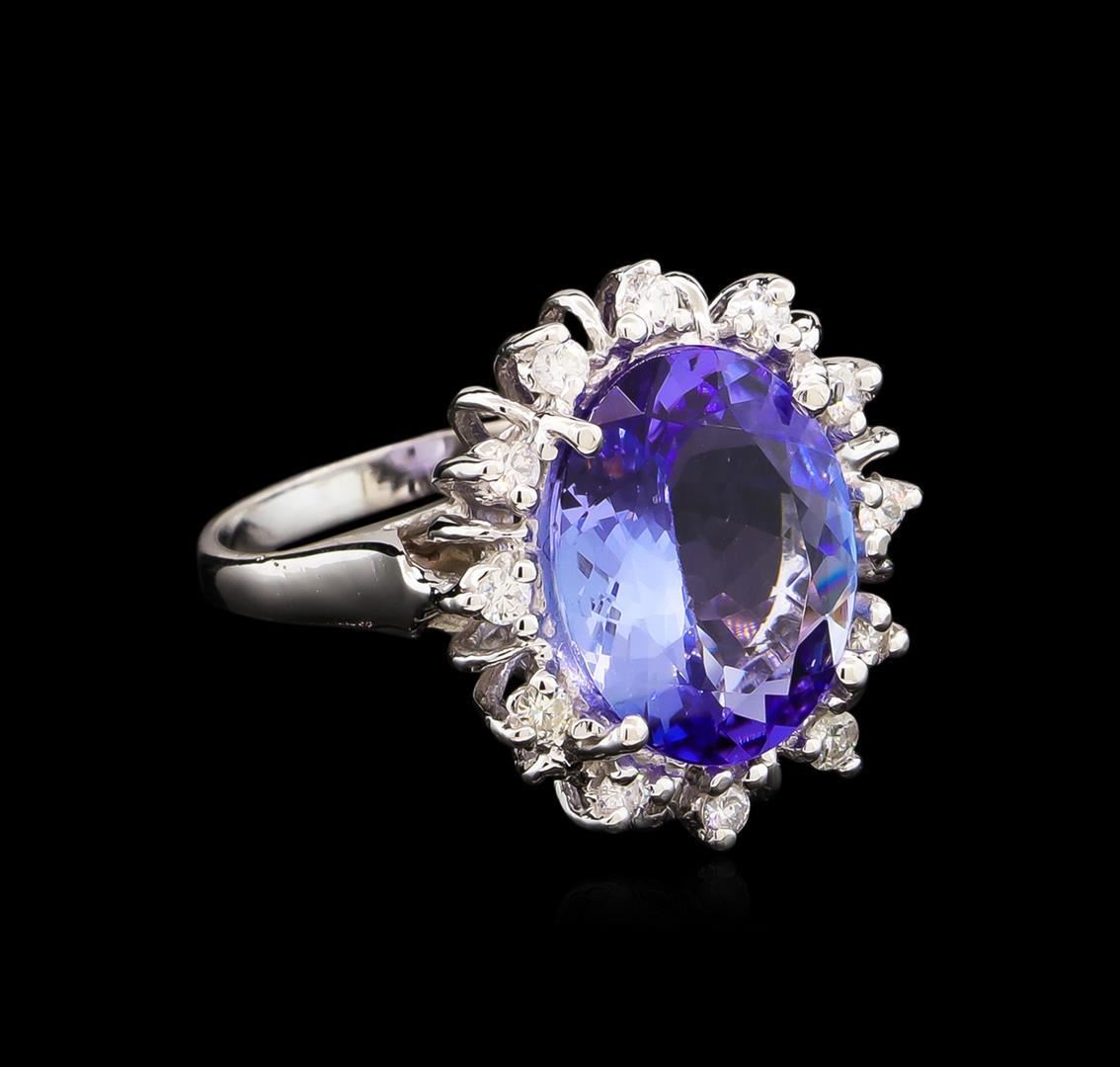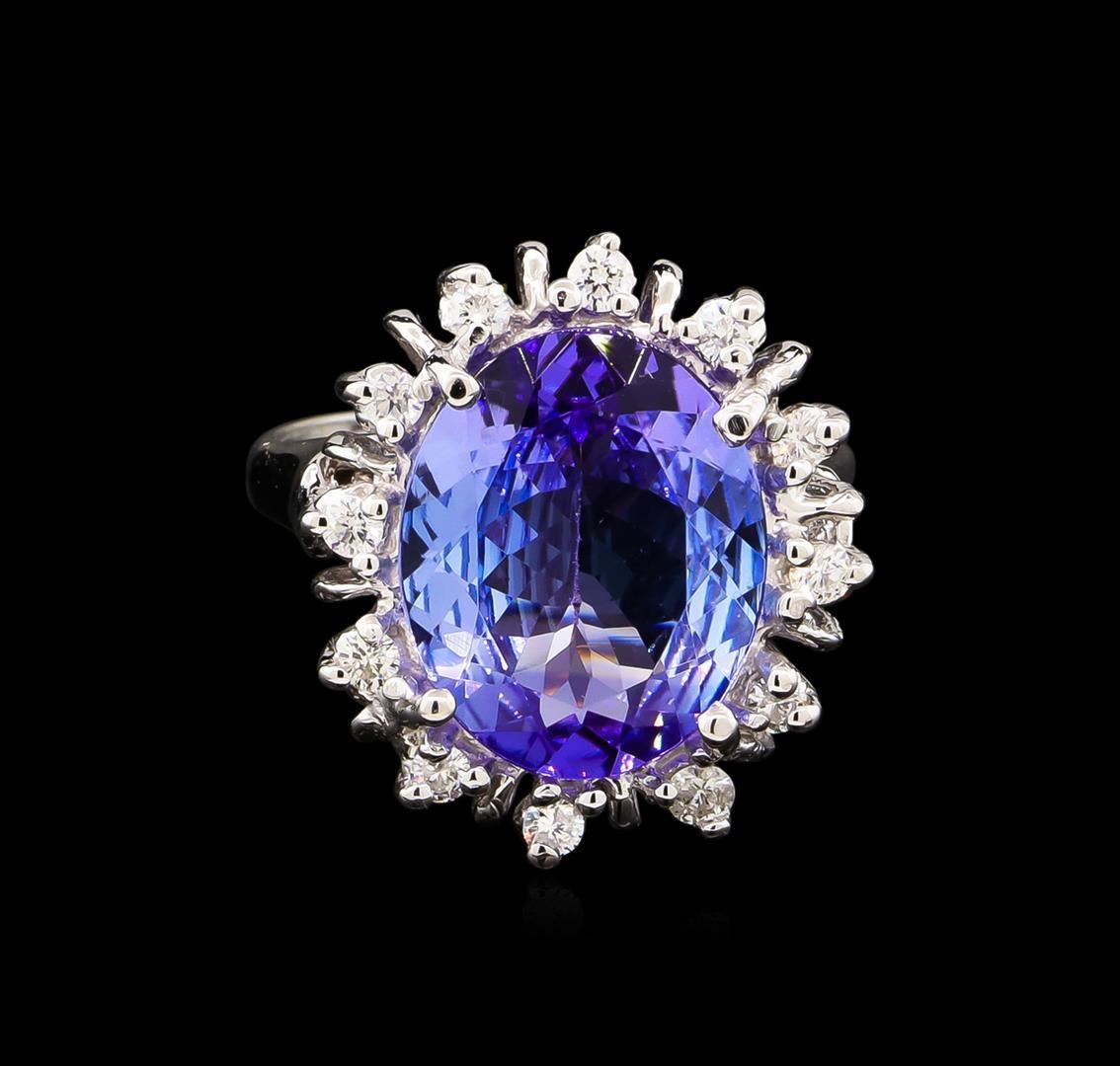 One electronically tested 14KT white gold lady's cast fashion ring with a basket halo with a bright polish finish. The featured lady's ring has a shank measuring 2.20 millimeters wide. Identified with markings of "14K". Condition is new, good workmanship. Containing: One prong set oval modified brilliant cut natural tanzanite, measuring 14.60 x 11.50 x 5.46mm, approximate weight of 6.55ct., clarity is eye clean, type I, light, moderately strong, violetish blue color, (GIA vB 3/4), cut is very good. Transmitting light with no distortion, transparent. Colored gemstones are presumed to have been subjected to commonly used enhancement processes. Graded in the setting. Twelve prong set round brilliant cut diamonds, measuring 2.10 - 2.00 x 1.23mm (depth est.) approximate total weight of 12 Stones = 0.36ct. Graded in the setting. Clarity: SI-1 to I-1. Color: H - I. Cut Good. Total Weight of Colored Stones 6.55ct. Total Weight of Diamonds 0.36ct. Total Weight of Ring 7.40gm. GAS Appraised.