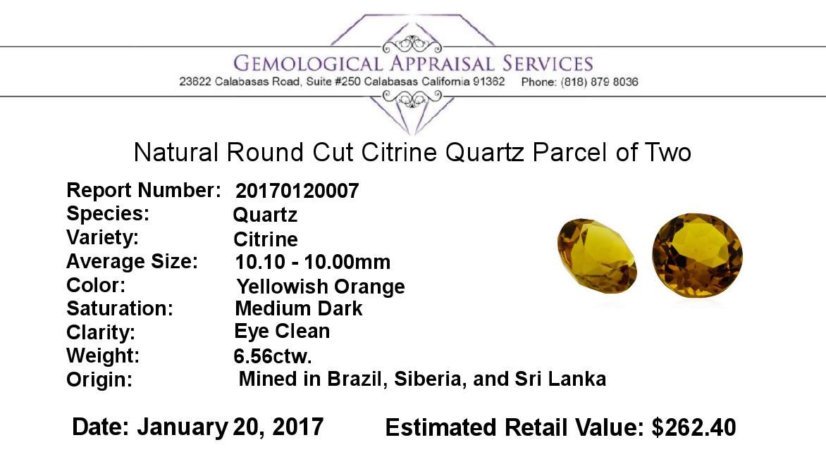 One natural round cut citrine quartz parcel of two with an exact weight of 6.56ctw., clarity is eye clean, yellowish orange, medium dark. Gemological Appraisals Services estimates the retail value at $262.4 GAS Appraised.
