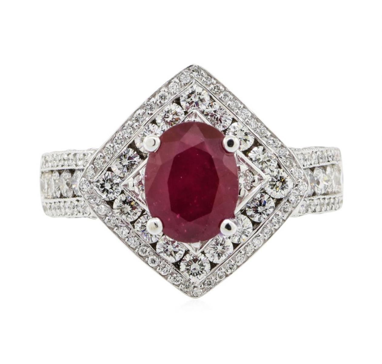 One electronically tested 14KT white gold lady's cast fashion ring with a cathedral shank with a bright polish with milgrain detailing finish. The featured lady's ring has a square cushion halo with diamond set shoulders and a shank measuring 3.90 millimeters wide. Identified with markings of '14K'. Condition is new, good workmanship. Containing: One prong set oval modified mixed cut natural ruby-glass composite, measuring 9.14 x 7.15 x 5.05mm, (depth est.) 10%. bulge factor, approximate weight of 3.25ct., clarity is heavily included, medium dark, moderately strong, red color, (GIA R 6/4), cut is good. Transmitting light somewhat diffusely, semi-transparent to translucent. Naturally occurring internal & external characteristics are present. Indications of laboratory high temperature heat treatment, with glass & flux additives. Colored gemstones are presumed to have been subjected to commonly used enhancement processes. Graded in the setting. Twenty-Four channel set round brilliant cut diamonds, measuring 2.40 - 2.30 x 1.46mm (depth est.) approximate total weight of 24 Stones = 1.20ct. Graded in the setting. Color G - H Clarity VS-2 to SI-1 Cut Very Good Twelve bead set round brilliant cut diamonds, measuring 2.70 - 2.30 x 1.55mm (depth est.) approximate total weight of 12 Stones = 0.70ct. Graded in the setting. Color G - I Clarity VS-2 to SI-1 Cut Good Thirty-Six bead set round brilliant cut diamonds, measuring 2.30 - 1.90 x 1.30mm (depth est.) approximate total weight of 36 Stones = 1.25ct. Graded in the setting. Color G - I Clarity VS-2 to SI-1 Cut Very Good Forty-Six bead set round brilliant cut diamonds, measuring 1.00 - 0.95 x 0.61mm (depth est.) approximate total weight of 46 Stones = 0.16ct. Graded in the setting. Color G - H Clarity VS-2 to SI-1 Cut Very Good. Total Weight of Colored Stones 3.25ct.. Total Weight of Diamonds 3.31ct.. Total Weight of Ring 11.00gm GAS Appraised at $11560.00. GAS Appraised.
