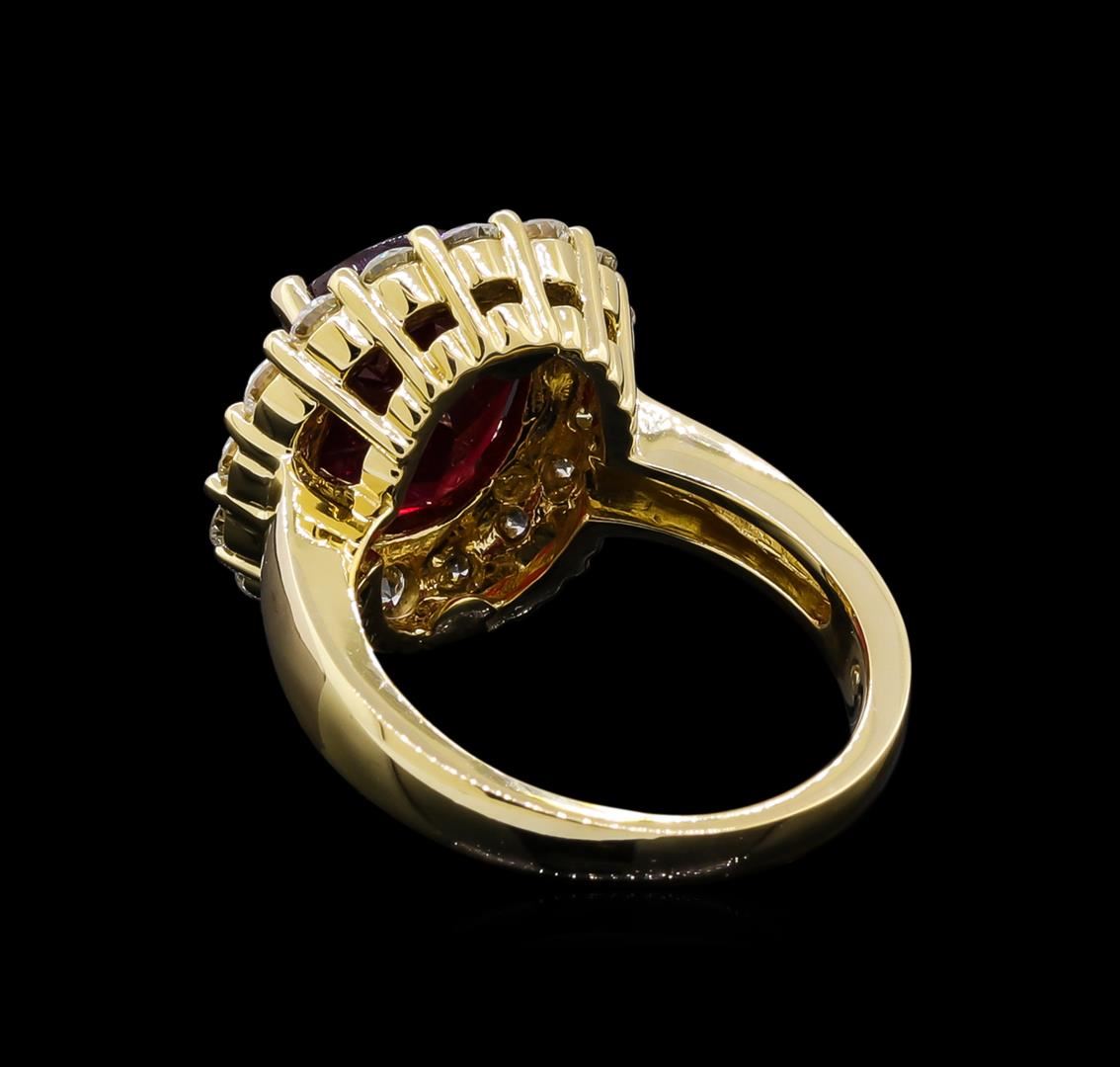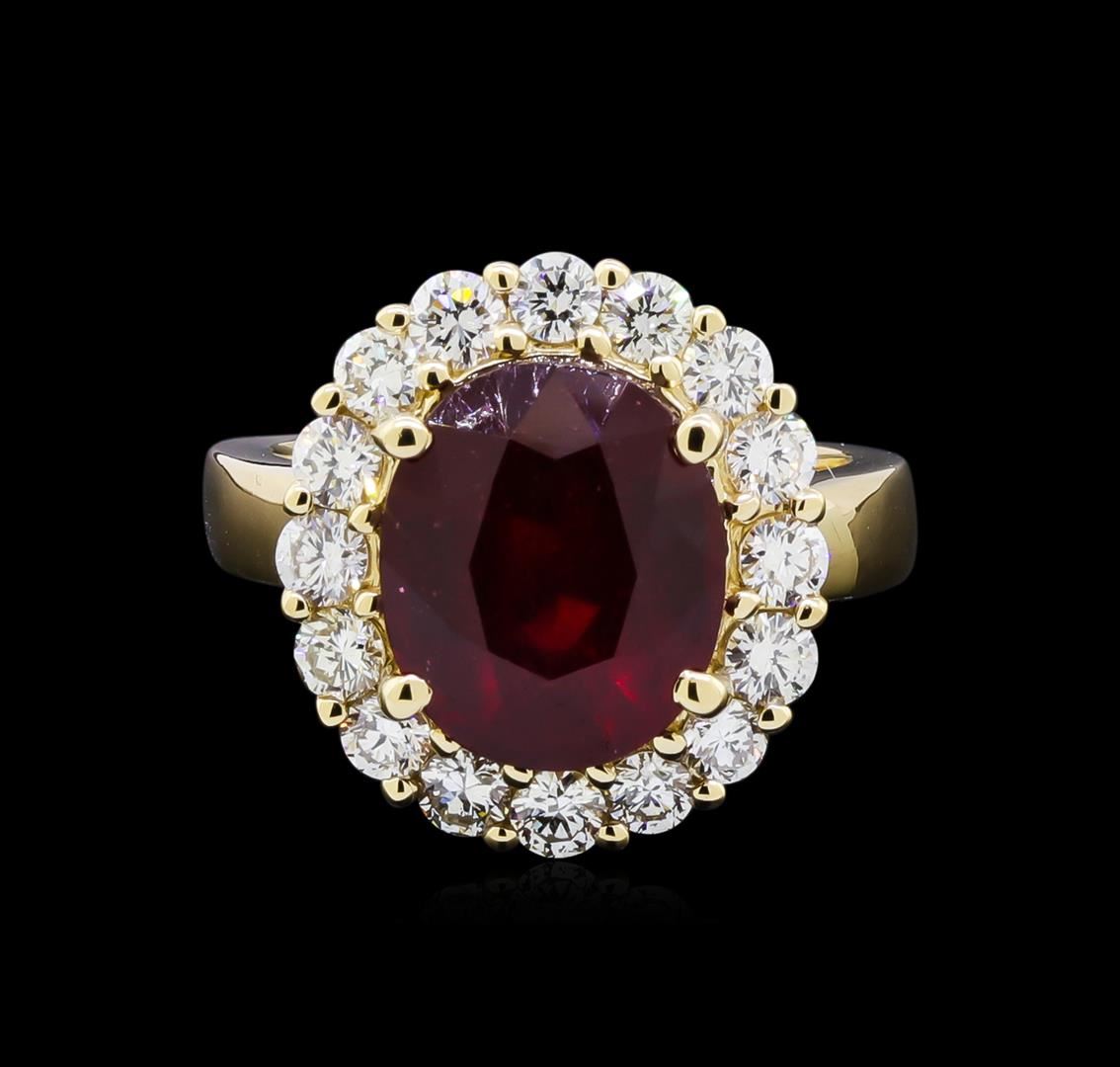 One electronically tested 14KT yellow gold ladies cast ruby and diamond ring with a bright polish finish. The featured ruby is set within a diamond floret, completed by a two and one-half millimeter wide band. Condition is good. Containing: One prong set oval mixed cut natural ruby, measuring 11.45 x 9.60 x 6.72mm, 6%. bulge factor, approximate weight of 6.58ct., clarity is heavily included, type II, dark, very slightly brownish, slightly purplish red color, (GIA slpR 7/3), cut is good. Transmitting light somewhat diffusely, transparent to translucent. Naturally occurring internal & external characteristics are present. Indications of laboratory high temperature heat treatment, with glass & flux additives. Graded in the setting. Ruby has a low tolerance to rhodium plating, repolishing the surface, & ultrasonic cleaning. Sixteen prong set round brilliant cut diamonds, measuring 2.50 - 2.40 x 1.47mm (depth est.) approximate total weight of 16 Stones = 1.00ct. Graded in the setting. Clarity: VVS-2 to VS-2. Color: G - I. Total Weight of Colored Stones 6.58ct. Total Weight of Diamonds 1.00ct. Total Weight of Ring 7.61gm. AIG Appraised at $5,945.00.