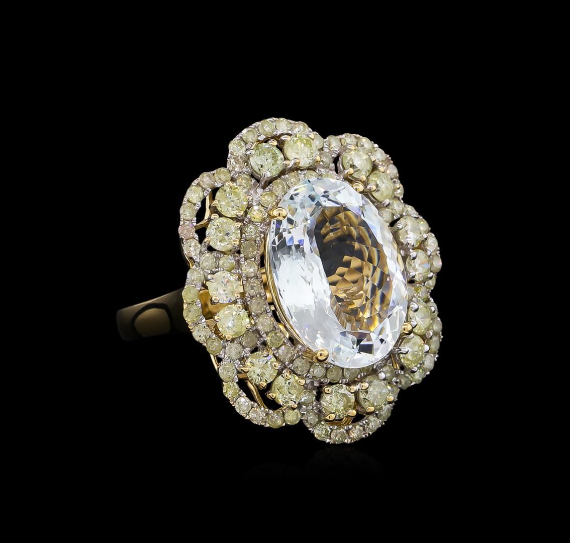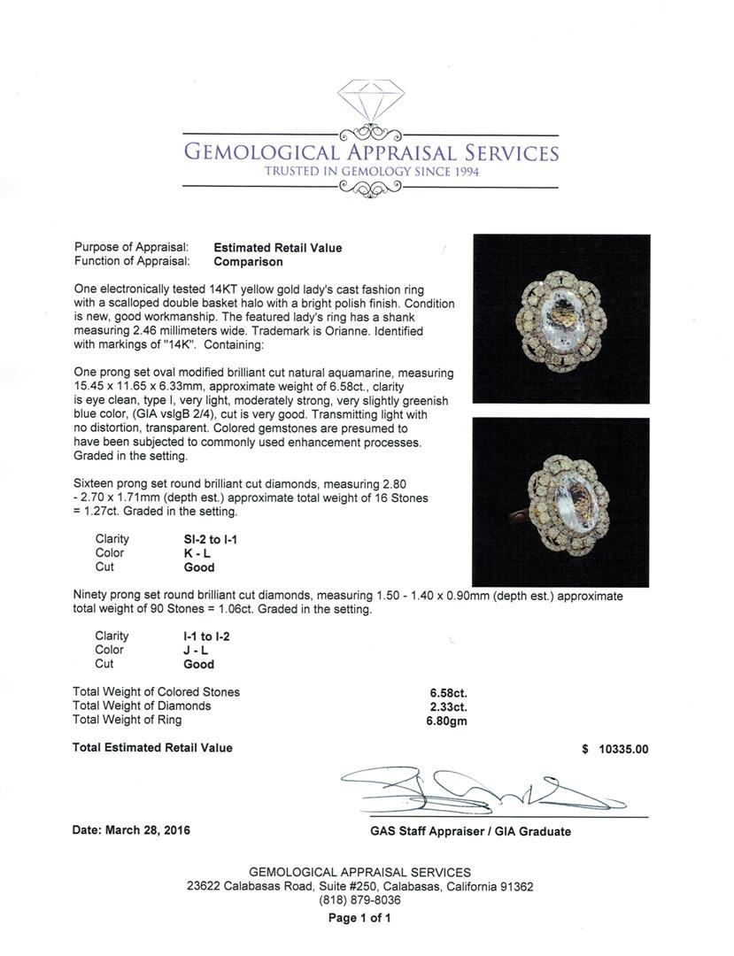 One electronically tested 14KT yellow gold lady's cast fashion ring with a scalloped double basket halo with a bright polish finish. The featured lady's ring has a shank measuring 2.46 millimeters wide. Trademark is Orianne. Identified with markings of '14K'. Condition is new, good workmanship. Containing: One prong set oval modified brilliant cut natural aquamarine, measuring 15.45 x 11.65 x 6.33mm, approximate weight of 6.58ct., clarity is eye clean, type I, very light, moderately strong, very slightly greenish blue color, (GIA vslgB 2/4), cut is very good. Transmitting light with no distortion, transparent. Colored gemstones are presumed to have been subjected to commonly used enhancement processes. Graded in the setting. Sixteen prong set round brilliant cut diamonds, measuring 2.80 - 2.70 x 1.71mm (depth est.) approximate total weight of 16 Stones = 1.27ct. Graded in the setting. Clarity SI-2 to I-1. Color: K - L Cut Good Ninety prong set round brilliant cut diamonds, measuring 1.50 - 1.40 x 0.90mm (depth est.) approximate total weight of 90 Stones = 1.06ct. Graded in the setting. Clarity I-1 to I-2. Color: J - L Cut Good. Total Weight of Colored Stones 6.58ct.. Total Weight of Diamonds 2.33ct.. Total Weight of Ring 6.80gm. GAS Appraised at $10,335.00.