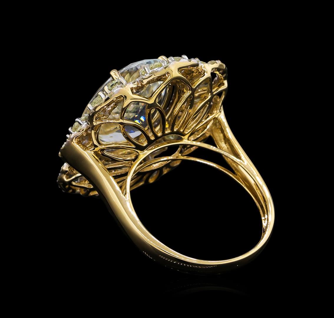 One electronically tested 14KT yellow gold lady's cast fashion ring with a scalloped double basket halo with a bright polish finish. The featured lady's ring has a shank measuring 2.46 millimeters wide. Trademark is Orianne. Identified with markings of '14K'. Condition is new, good workmanship. Containing: One prong set oval modified brilliant cut natural aquamarine, measuring 15.45 x 11.65 x 6.33mm, approximate weight of 6.58ct., clarity is eye clean, type I, very light, moderately strong, very slightly greenish blue color, (GIA vslgB 2/4), cut is very good. Transmitting light with no distortion, transparent. Colored gemstones are presumed to have been subjected to commonly used enhancement processes. Graded in the setting. Sixteen prong set round brilliant cut diamonds, measuring 2.80 - 2.70 x 1.71mm (depth est.) approximate total weight of 16 Stones = 1.27ct. Graded in the setting. Clarity SI-2 to I-1. Color: K - L Cut Good Ninety prong set round brilliant cut diamonds, measuring 1.50 - 1.40 x 0.90mm (depth est.) approximate total weight of 90 Stones = 1.06ct. Graded in the setting. Clarity I-1 to I-2. Color: J - L Cut Good. Total Weight of Colored Stones 6.58ct.. Total Weight of Diamonds 2.33ct.. Total Weight of Ring 6.80gm. GAS Appraised at $10,335.00.