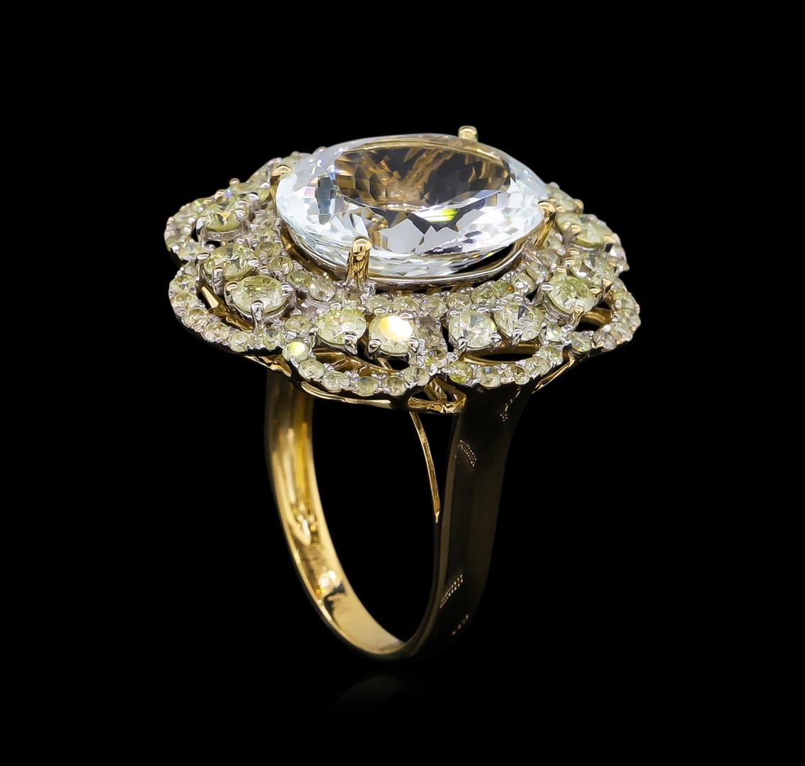 One electronically tested 14KT yellow gold lady's cast fashion ring with a scalloped double basket halo with a bright polish finish. The featured lady's ring has a shank measuring 2.46 millimeters wide. Trademark is Orianne. Identified with markings of '14K'. Condition is new, good workmanship. Containing: One prong set oval modified brilliant cut natural aquamarine, measuring 15.45 x 11.65 x 6.33mm, approximate weight of 6.58ct., clarity is eye clean, type I, very light, moderately strong, very slightly greenish blue color, (GIA vslgB 2/4), cut is very good. Transmitting light with no distortion, transparent. Colored gemstones are presumed to have been subjected to commonly used enhancement processes. Graded in the setting. Sixteen prong set round brilliant cut diamonds, measuring 2.80 - 2.70 x 1.71mm (depth est.) approximate total weight of 16 Stones = 1.27ct. Graded in the setting. Clarity SI-2 to I-1. Color: K - L Cut Good Ninety prong set round brilliant cut diamonds, measuring 1.50 - 1.40 x 0.90mm (depth est.) approximate total weight of 90 Stones = 1.06ct. Graded in the setting. Clarity I-1 to I-2. Color: J - L Cut Good. Total Weight of Colored Stones 6.58ct.. Total Weight of Diamonds 2.33ct.. Total Weight of Ring 6.80gm. GAS Appraised at $10,335.00.