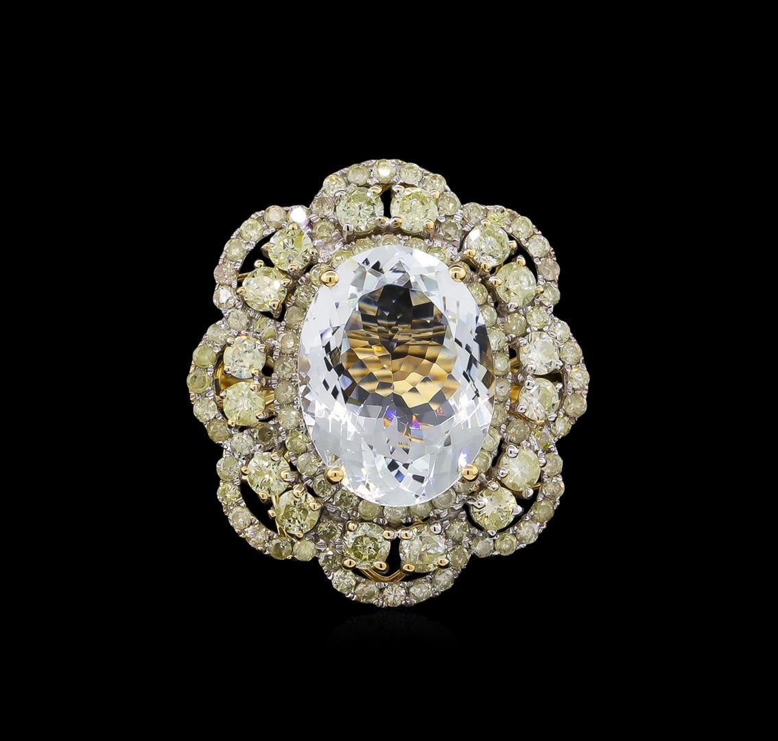 One electronically tested 14KT yellow gold lady's cast fashion ring with a scalloped double basket halo with a bright polish finish. The featured lady's ring has a shank measuring 2.46 millimeters wide. Trademark is Orianne. Identified with markings of '14K'. Condition is new, good workmanship. Containing: One prong set oval modified brilliant cut natural aquamarine, measuring 15.45 x 11.65 x 6.33mm, approximate weight of 6.58ct., clarity is eye clean, type I, very light, moderately strong, very slightly greenish blue color, (GIA vslgB 2/4), cut is very good. Transmitting light with no distortion, transparent. Colored gemstones are presumed to have been subjected to commonly used enhancement processes. Graded in the setting. Sixteen prong set round brilliant cut diamonds, measuring 2.80 - 2.70 x 1.71mm (depth est.) approximate total weight of 16 Stones = 1.27ct. Graded in the setting. Clarity SI-2 to I-1. Color: K - L Cut Good Ninety prong set round brilliant cut diamonds, measuring 1.50 - 1.40 x 0.90mm (depth est.) approximate total weight of 90 Stones = 1.06ct. Graded in the setting. Clarity I-1 to I-2. Color: J - L Cut Good. Total Weight of Colored Stones 6.58ct.. Total Weight of Diamonds 2.33ct.. Total Weight of Ring 6.80gm. GAS Appraised at $10,335.00.