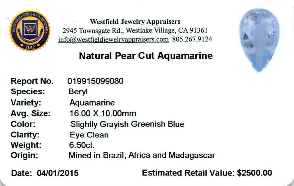 One pear cut natural aquamarine exact weight 6.50ct., clarity is eye clean, type I, medium, slightly grayish, very slightly greenish blue color, (GIA vslgB 5/2), cut is good. Westfield Appraised at $2,500.00.