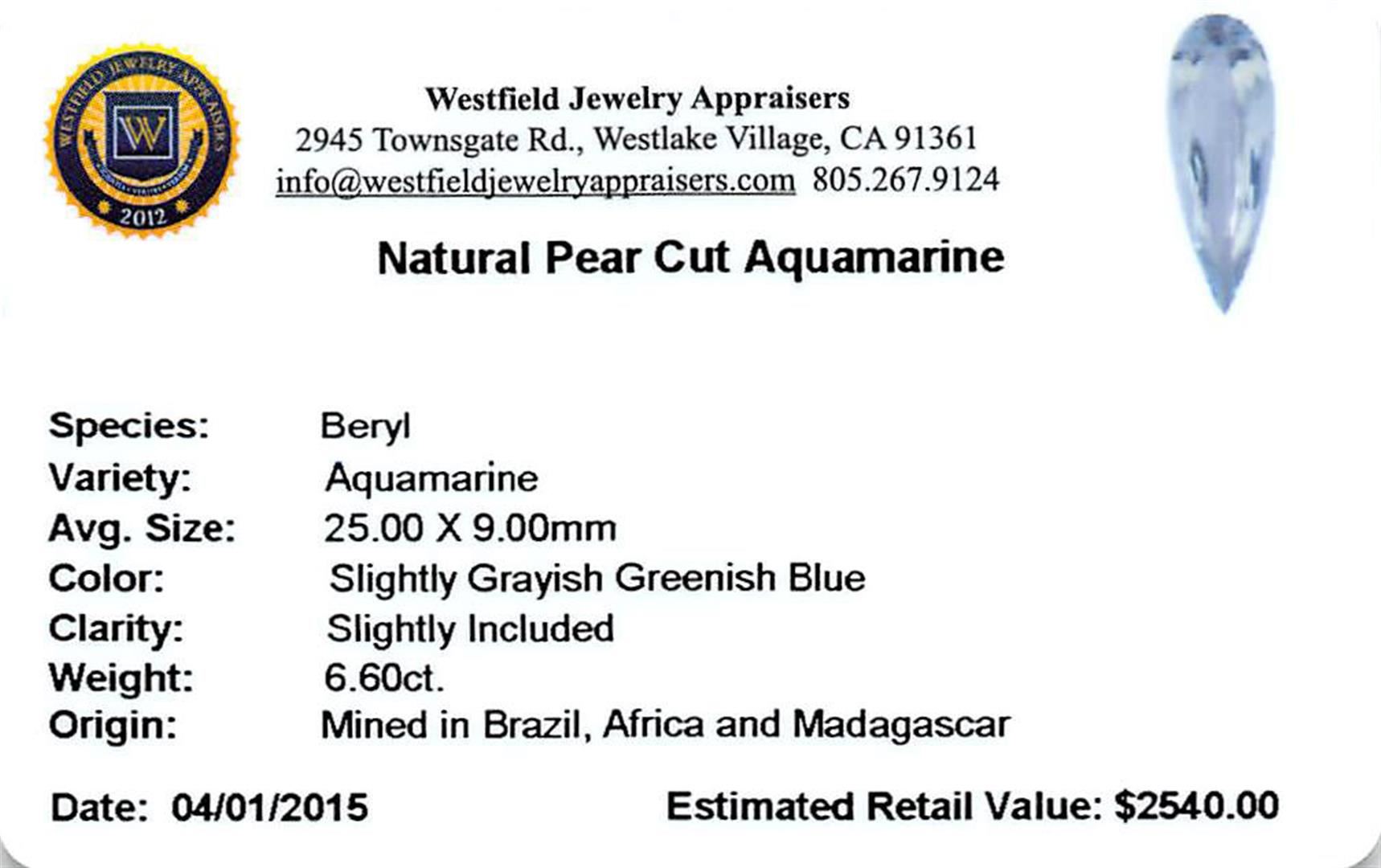 One pear cut natural aquamarine exact weight 6.60ct., clarity is slightly included, type I, medium, very slightly grayish, blue color, (GIA B 5/3), cut is good. Westfield Appraised at $2,540.00.