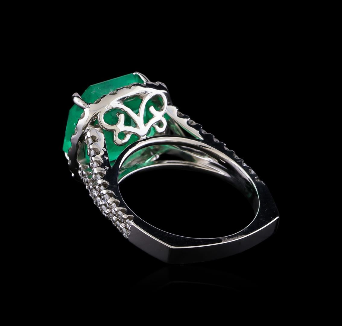 One electronically tested 14KT white gold lady's cast fashion ring with a split shank basket halo with a bright polish finish. The featured lady's ring has a European shank measuring 2.56 millimeters in width. Identified with markings of "14K". Condition is new, good workmanship. Containing: One prong set square emerald step cut natural emerald, measuring 11.52 x 11.27 x 8.64mm, (depth est.) approximate weight of 6.60ct., clarity is heavily included, medium light, moderately strong, green color, (GIA G 4/4), cut is good. Transmitting light somewhat diffusely, transparent to translucent. Colored gemstones are presumed to have been subjected to commonly used enhancement processes. Indications of oil residue. Graded in the setting. Twenty prong set round brilliant cut diamonds, measuring 1.70 - 1.65 x 1.06mm (depth est.) approximate total weight of 20 Stones = 0.38ct. Graded in the setting. Clarity: VS-2 to SI-2. Color: G - Good Thirty-Six prong set round brilliant cut diamonds, measuring 1.60 - 1.30 x 0.90mm (depth est.) approximate total weight of 36 Stones = 0.41ct. Graded in the setting. Clarity: SI-1 to SI-2. Color: G - Good. Total Weight of Colored Stones 6.60ct. Total Weight of Diamonds 0.79ct. Total Weight of Ring 6.80gm. GAS Appraised at $13,730.00.
