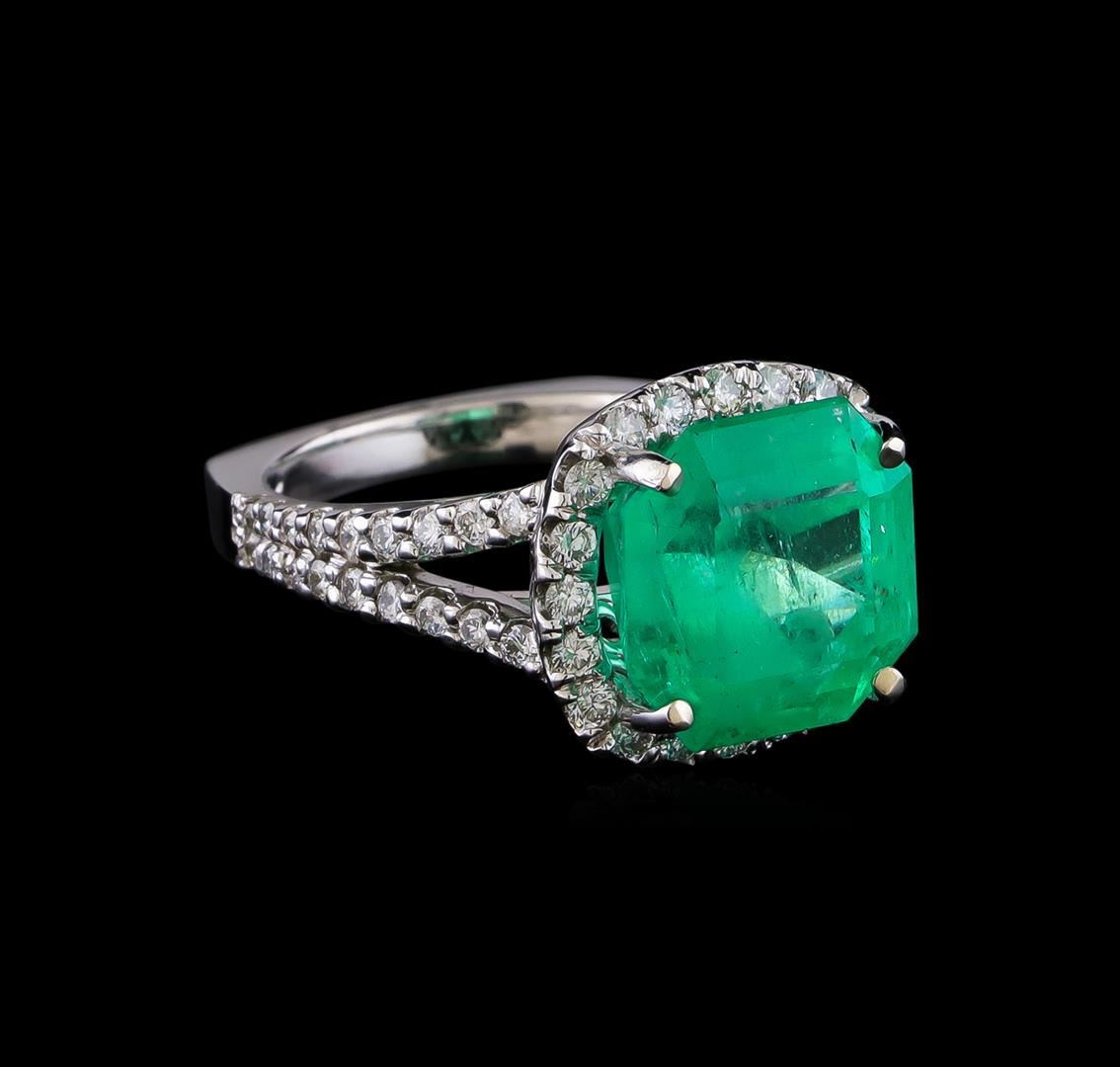 One electronically tested 14KT white gold lady's cast fashion ring with a split shank basket halo with a bright polish finish. The featured lady's ring has a European shank measuring 2.56 millimeters in width. Identified with markings of "14K". Condition is new, good workmanship. Containing: One prong set square emerald step cut natural emerald, measuring 11.52 x 11.27 x 8.64mm, (depth est.) approximate weight of 6.60ct., clarity is heavily included, medium light, moderately strong, green color, (GIA G 4/4), cut is good. Transmitting light somewhat diffusely, transparent to translucent. Colored gemstones are presumed to have been subjected to commonly used enhancement processes. Indications of oil residue. Graded in the setting. Twenty prong set round brilliant cut diamonds, measuring 1.70 - 1.65 x 1.06mm (depth est.) approximate total weight of 20 Stones = 0.38ct. Graded in the setting. Clarity: VS-2 to SI-2. Color: G - Good Thirty-Six prong set round brilliant cut diamonds, measuring 1.60 - 1.30 x 0.90mm (depth est.) approximate total weight of 36 Stones = 0.41ct. Graded in the setting. Clarity: SI-1 to SI-2. Color: G - Good. Total Weight of Colored Stones 6.60ct. Total Weight of Diamonds 0.79ct. Total Weight of Ring 6.80gm. GAS Appraised at $13,730.00.