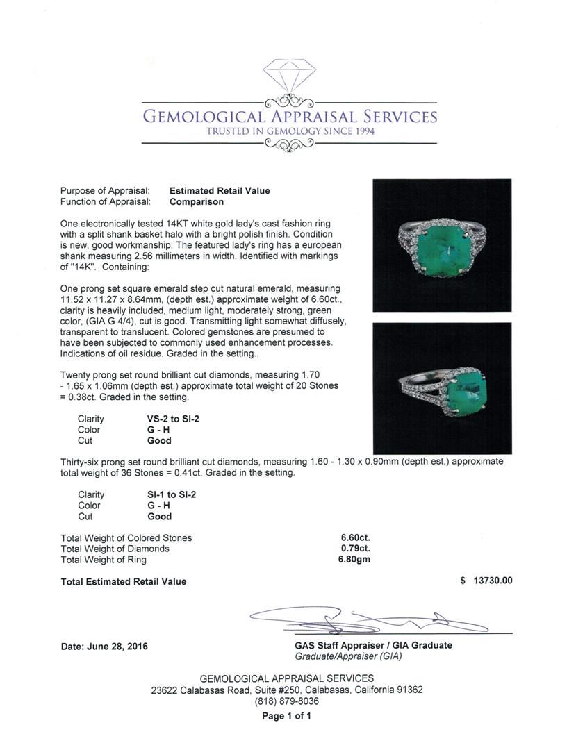 One electronically tested 14KT white gold lady's cast fashion ring with a split shank basket halo with a bright polish finish. The featured lady's ring has a European shank measuring 2.56 millimeters in width. Identified with markings of "14K". Condition is new, good workmanship. Containing: One prong set square emerald step cut natural emerald, measuring 11.52 x 11.27 x 8.64mm, (depth est.) approximate weight of 6.60ct., clarity is heavily included, medium light, moderately strong, green color, (GIA G 4/4), cut is good. Transmitting light somewhat diffusely, transparent to translucent. Colored gemstones are presumed to have been subjected to commonly used enhancement processes. Indications of oil residue. Graded in the setting. Twenty prong set round brilliant cut diamonds, measuring 1.70 - 1.65 x 1.06mm (depth est.) approximate total weight of 20 Stones = 0.38ct. Graded in the setting. Clarity: VS-2 to SI-2. Color: G - Good Thirty-Six prong set round brilliant cut diamonds, measuring 1.60 - 1.30 x 0.90mm (depth est.) approximate total weight of 36 Stones = 0.41ct. Graded in the setting. Clarity: SI-1 to SI-2. Color: G - Good. Total Weight of Colored Stones 6.60ct. Total Weight of Diamonds 0.79ct. Total Weight of Ring 6.80gm. GAS Appraised at $13,730.00.