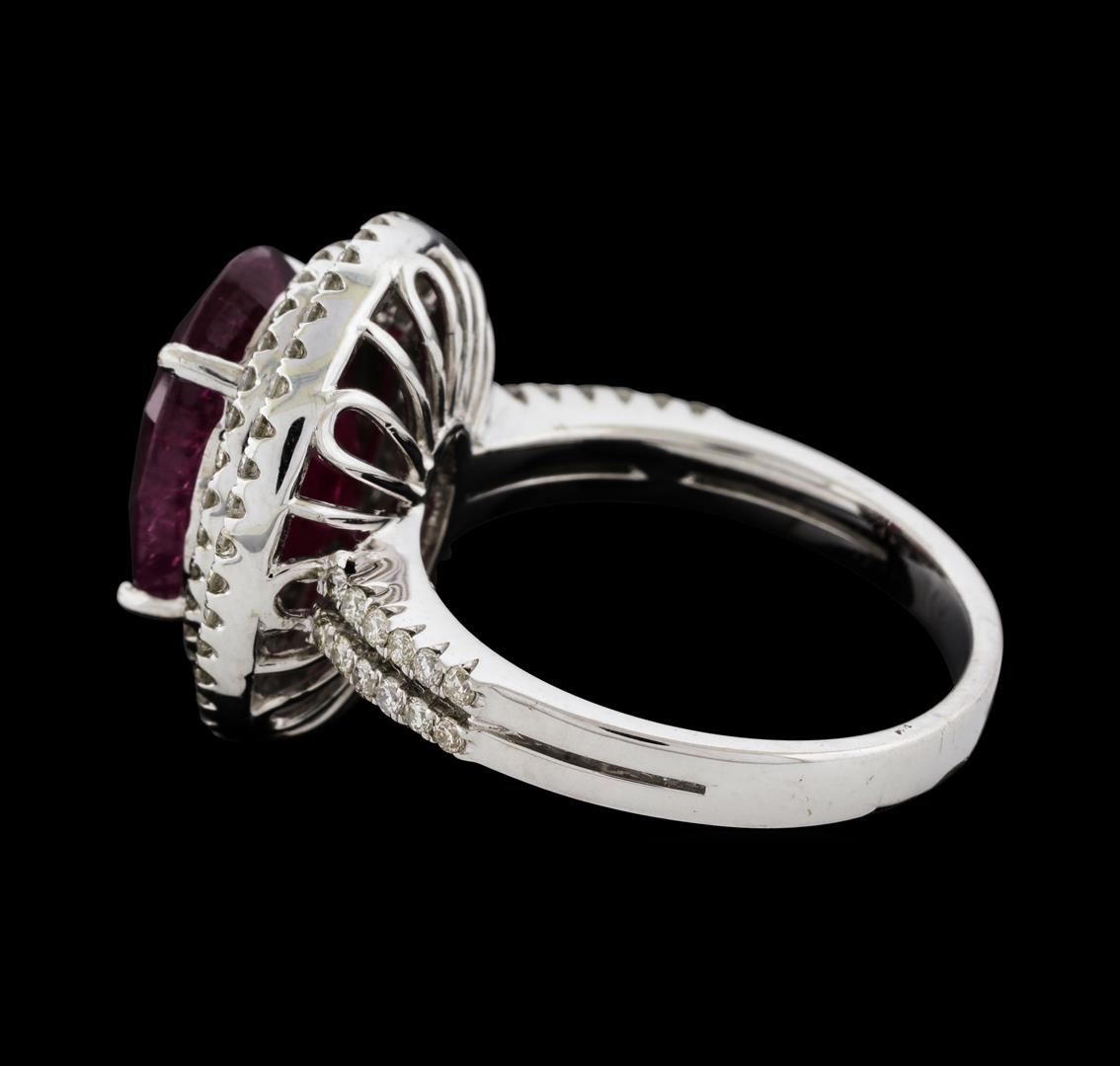 One electronically tested 14KT white gold lady's cast fashion ring with a split shank double basket halo with a bright polish finish. The featured lady's ring has a shank measuring 2.60 millimeters wide. Identified with markings of '14K'. Condition is new, good workmanship. Containing: One prong set oval modified brilliant cut natural ruby, measuring 12.22 x 9.60 x 6.23mm, (depth est.) 7%. bulge factor, approximate weight of 6.60ct., clarity is heavily included, medium dark, very slightly brownish, red color, (GIA R 6/3), cut is good. Transmitting light somewhat diffusely, semi-transparent to translucent. Indications of laboratory high temperature heat treatment. Colored gemstones are presumed to have been subjected to commonly used enhancement processes. Graded in the setting. Ninety-Seven prong set round brilliant cut diamonds, measuring 1.30 - 1.20 x 0.75mm (depth est.) approximate total weight of 97 Stones = 0.69ct. Graded in the setting. Clarity SI-1 to SI-2. Color: H - I Cut Good. Total Weight of Colored Stones 6.60ct.. Total Weight of Diamonds 0.69ct.. Total Weight of Ring 6.70gm. GAS Appraised at $12,715.00.