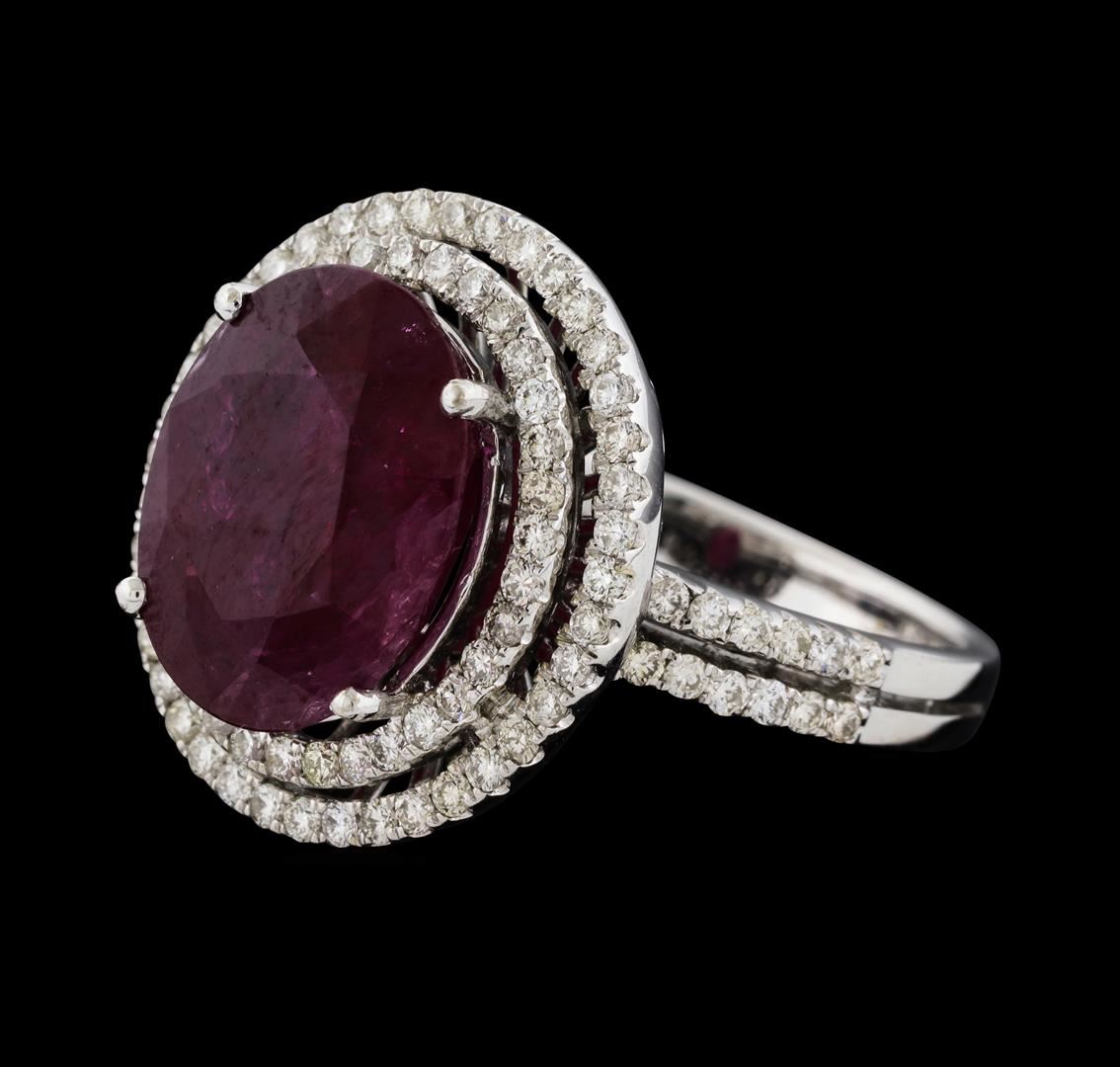 One electronically tested 14KT white gold lady's cast fashion ring with a split shank double basket halo with a bright polish finish. The featured lady's ring has a shank measuring 2.60 millimeters wide. Identified with markings of '14K'. Condition is new, good workmanship. Containing: One prong set oval modified brilliant cut natural ruby, measuring 12.22 x 9.60 x 6.23mm, (depth est.) 7%. bulge factor, approximate weight of 6.60ct., clarity is heavily included, medium dark, very slightly brownish, red color, (GIA R 6/3), cut is good. Transmitting light somewhat diffusely, semi-transparent to translucent. Indications of laboratory high temperature heat treatment. Colored gemstones are presumed to have been subjected to commonly used enhancement processes. Graded in the setting. Ninety-Seven prong set round brilliant cut diamonds, measuring 1.30 - 1.20 x 0.75mm (depth est.) approximate total weight of 97 Stones = 0.69ct. Graded in the setting. Clarity SI-1 to SI-2. Color: H - I Cut Good. Total Weight of Colored Stones 6.60ct.. Total Weight of Diamonds 0.69ct.. Total Weight of Ring 6.70gm. GAS Appraised at $12,715.00.