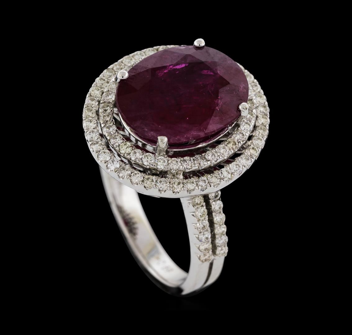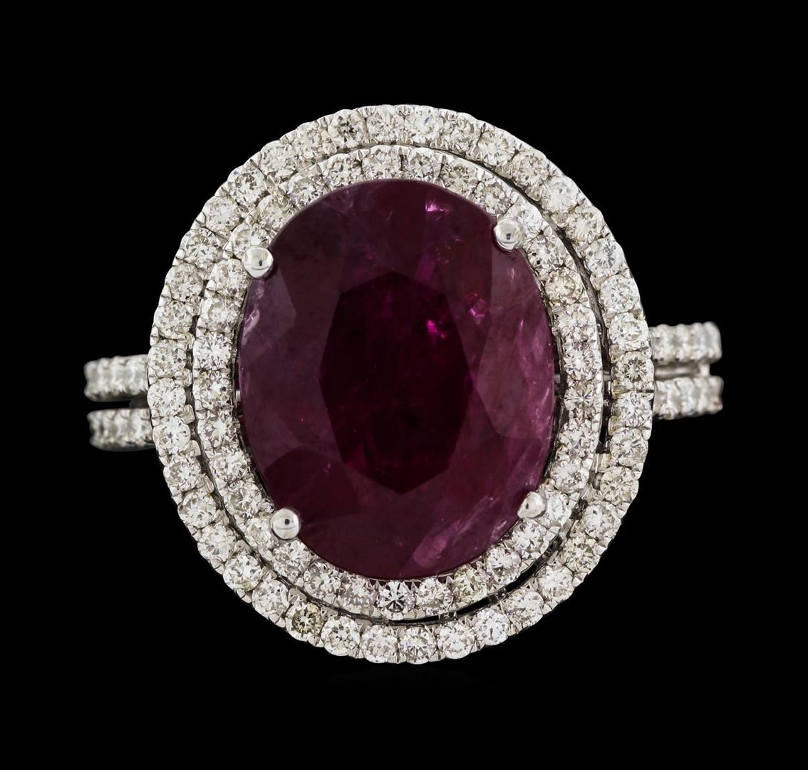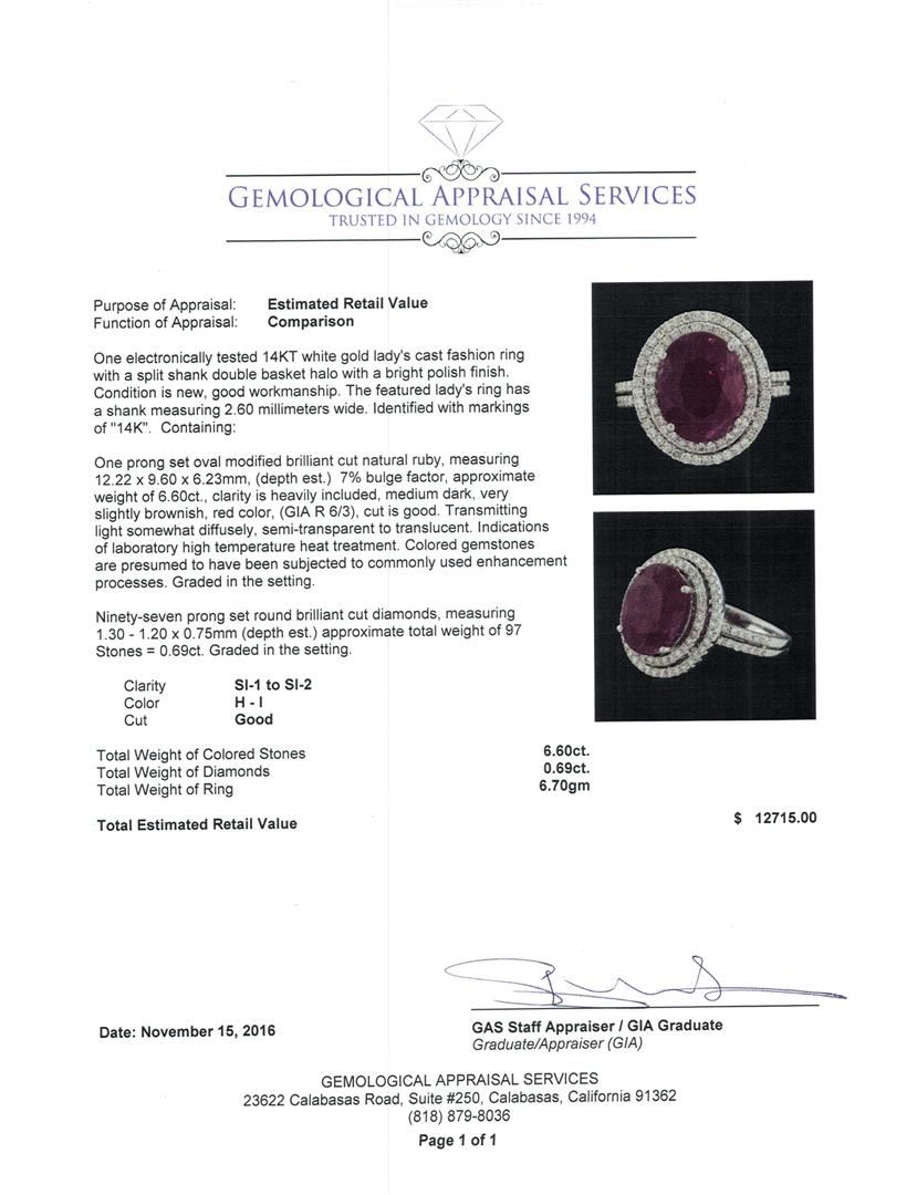 One electronically tested 14KT white gold lady's cast fashion ring with a split shank double basket halo with a bright polish finish. The featured lady's ring has a shank measuring 2.60 millimeters wide. Identified with markings of '14K'. Condition is new, good workmanship. Containing: One prong set oval modified brilliant cut natural ruby, measuring 12.22 x 9.60 x 6.23mm, (depth est.) 7%. bulge factor, approximate weight of 6.60ct., clarity is heavily included, medium dark, very slightly brownish, red color, (GIA R 6/3), cut is good. Transmitting light somewhat diffusely, semi-transparent to translucent. Indications of laboratory high temperature heat treatment. Colored gemstones are presumed to have been subjected to commonly used enhancement processes. Graded in the setting. Ninety-Seven prong set round brilliant cut diamonds, measuring 1.30 - 1.20 x 0.75mm (depth est.) approximate total weight of 97 Stones = 0.69ct. Graded in the setting. Clarity SI-1 to SI-2. Color: H - I Cut Good. Total Weight of Colored Stones 6.60ct.. Total Weight of Diamonds 0.69ct.. Total Weight of Ring 6.70gm. GAS Appraised at $12,715.00.