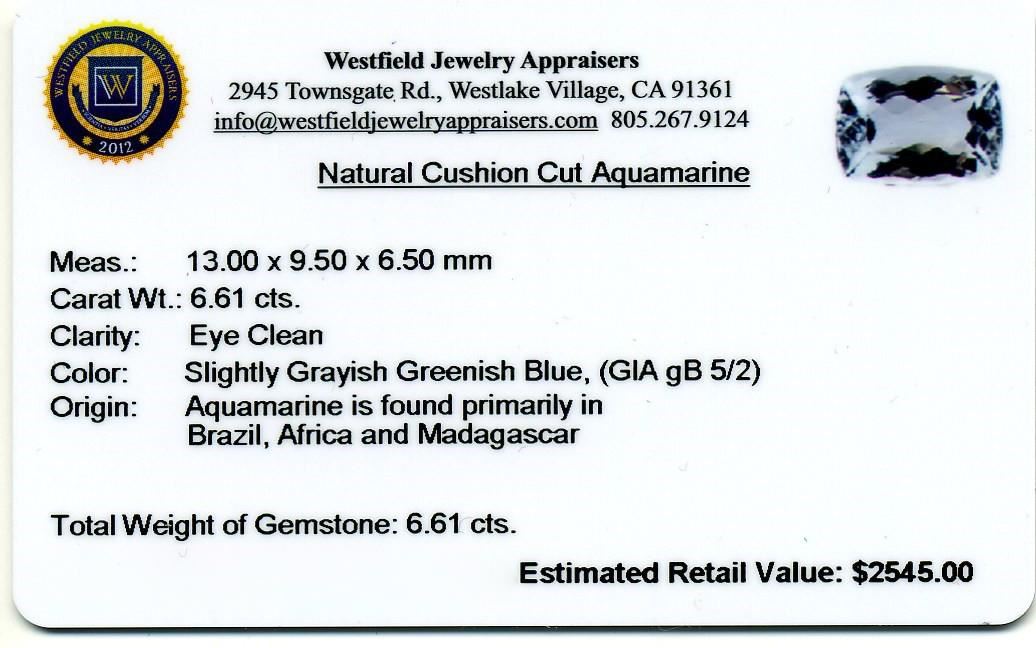 6.61ct Cushion Cut Natural Cushion Cut Aquamarine. Westfield Appraised.