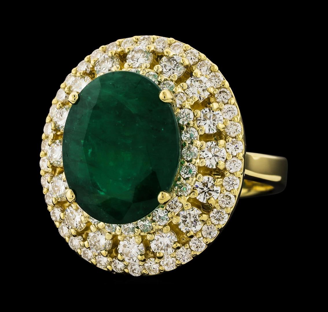 One electronically tested 14KT yellow gold lady's cast fashion ring with a triple basket halo with a bright polish finish. The featured lady's ring has a shank measuring 3.75 millimeters wide. Identified with markings of 'K14'. Condition is new, good workmanship. Containing: One prong set oval modified mixed cut natural emerald, measuring 13.84 x 11.04 x 6.50mm, (depth est.) 15%. bulge factor, approximate weight of 6.63ct., clarity is heavily included, medium dark, moderately strong, green color, (GIA G 6/4), cut is good. Transmitting light somewhat diffusely, semi-transparent to translucent. Naturally occurring internal & external characteristics are present. Indications of oil residue. Colored gemstones are presumed to have been subjected to commonly used enhancement processes. Graded in the setting. Sixteen prong set round brilliant cut diamonds, measuring 2.50 - 2.40 x 1.49mm (depth est.) approximate total weight of 16 Stones = 0.88ct. Graded in the setting. Clarity SI-1 to SI-2. Color: H - I Cut Good Sixty-Two prong set round brilliant cut diamonds, measuring 1.60 - 1.55 x 0.96mm (depth est.) approximate total weight of 62 Stones = 0.90ct. Graded in the setting. Clarity SI-1 to SI-2. Color: G - H Cut Good. Total Weight of Colored Stones 6.63ct.. Total Weight of Diamonds 1.78ct.. Total Weight of Ring 10.90gm GAS Appraised at $12,220.00.