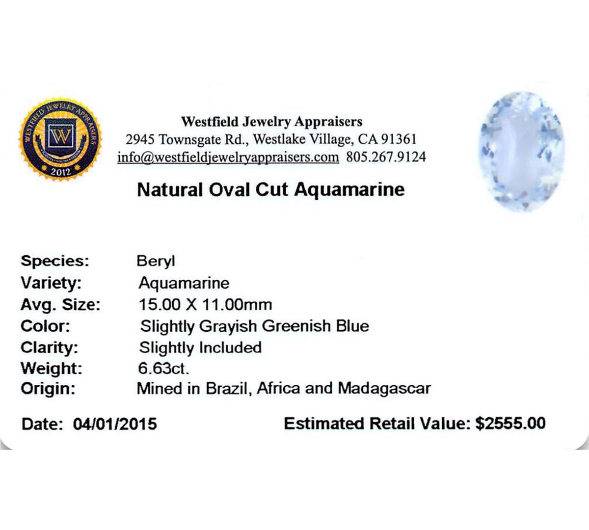 One oval cut natural aquamarine exact weight 6.63ct., clarity is slightly included, type I, medium, slightly grayish, very slightly greenish blue color, (GIA vslgB 5/2), cut is good. Westfield Appraised at $2,555.00.