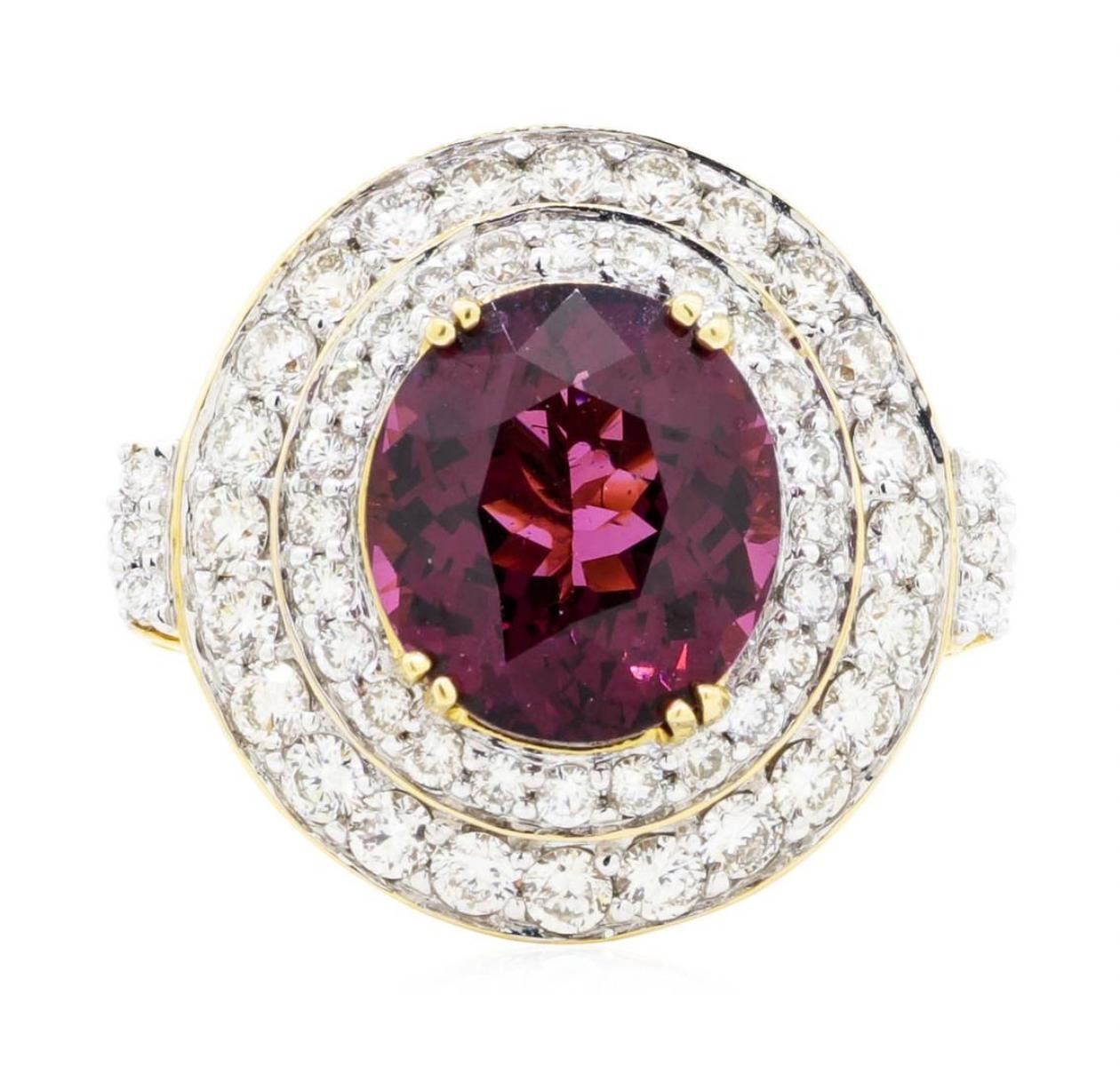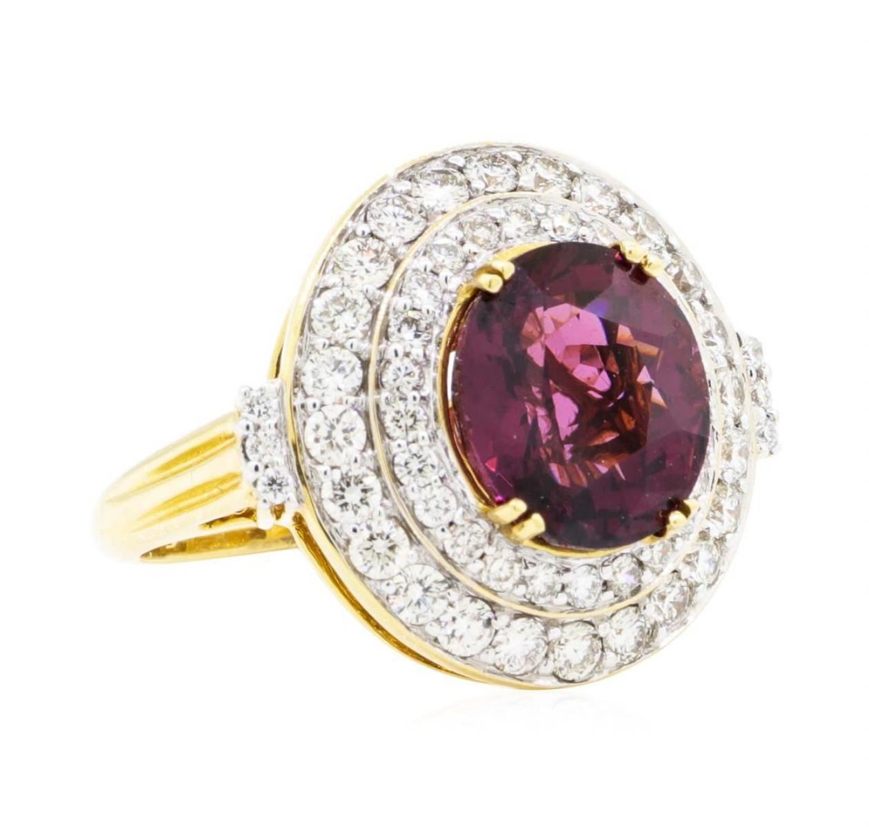 One electronically tested 18KT yellow gold lady's combination cast & assembled fashion ring with a double halo with a bright polish finish. The featured lady's ring has a shank measuring 1.90 millimeters wide. Identified with markings of '18K'. Condition is new, good workmanship. Containing: One prong set oval modified mixed cut natural lavender spinel, measuring 10.92 x 9.78 x 6.32mm, (depth est.) 5%. bulge factor, approximate weight of 5.35ct., clarity is eye clean, dark, moderately strong, purple red color, (GIA PR 7/4), cut is very good. Transmitting light with no distortion, transparent. Colored gemstones are presumed to have been subjected to commonly used enhancement processes. Graded in the setting. Twenty-Four prong set round brilliant cut diamonds, measuring 2.20 - 2.15 x 1.35mm (depth est.) approximate total weight of 24 Stones = 0.96ct. Graded in the setting. Color H - I Clarity VS-2 to SI-1 Cut Very Good Twenty-Four prong set round brilliant cut diamonds, measuring 1.50 - 1.40 x 0.90mm (depth est.) approximate total weight of 24 Stones = 0.28ct. Graded in the setting. Color H - I Clarity VS-2 to SI-1 Cut Good Six prong set round brilliant cut diamonds, measuring 1.30 - 1.25 x 0.78mm (depth est.) approximate total weight of 6 Stones = 0.05ct. Color H - I Clarity SI-1 to SI-2 Cut Good. Total Weight of Colored Stones 5.35ct.. Total Weight of Diamonds 1.29ct.. Total Weight of Ring 9.60gm GAS Appraised at $12930.00. GAS Appraised.