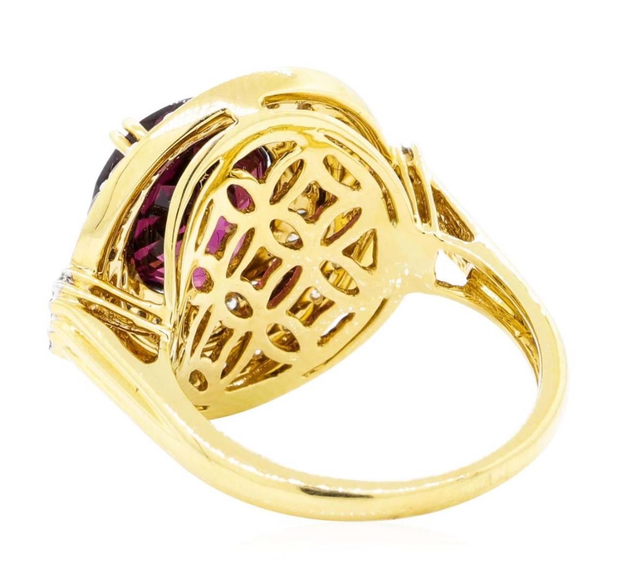 One electronically tested 18KT yellow gold lady's combination cast & assembled fashion ring with a double halo with a bright polish finish. The featured lady's ring has a shank measuring 1.90 millimeters wide. Identified with markings of '18K'. Condition is new, good workmanship. Containing: One prong set oval modified mixed cut natural lavender spinel, measuring 10.92 x 9.78 x 6.32mm, (depth est.) 5%. bulge factor, approximate weight of 5.35ct., clarity is eye clean, dark, moderately strong, purple red color, (GIA PR 7/4), cut is very good. Transmitting light with no distortion, transparent. Colored gemstones are presumed to have been subjected to commonly used enhancement processes. Graded in the setting. Twenty-Four prong set round brilliant cut diamonds, measuring 2.20 - 2.15 x 1.35mm (depth est.) approximate total weight of 24 Stones = 0.96ct. Graded in the setting. Color H - I Clarity VS-2 to SI-1 Cut Very Good Twenty-Four prong set round brilliant cut diamonds, measuring 1.50 - 1.40 x 0.90mm (depth est.) approximate total weight of 24 Stones = 0.28ct. Graded in the setting. Color H - I Clarity VS-2 to SI-1 Cut Good Six prong set round brilliant cut diamonds, measuring 1.30 - 1.25 x 0.78mm (depth est.) approximate total weight of 6 Stones = 0.05ct. Color H - I Clarity SI-1 to SI-2 Cut Good. Total Weight of Colored Stones 5.35ct.. Total Weight of Diamonds 1.29ct.. Total Weight of Ring 9.60gm GAS Appraised at $12930.00. GAS Appraised.