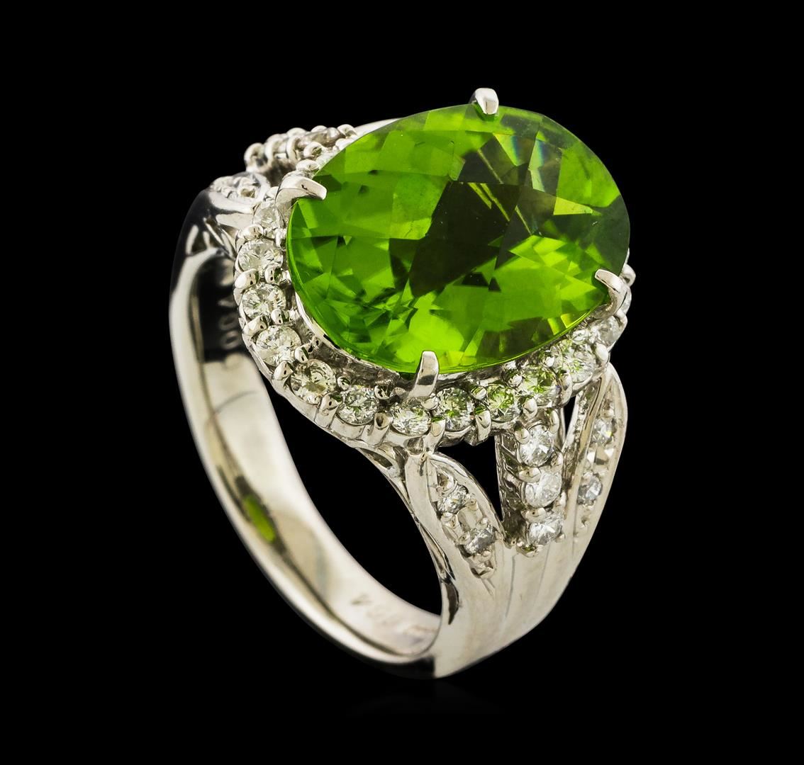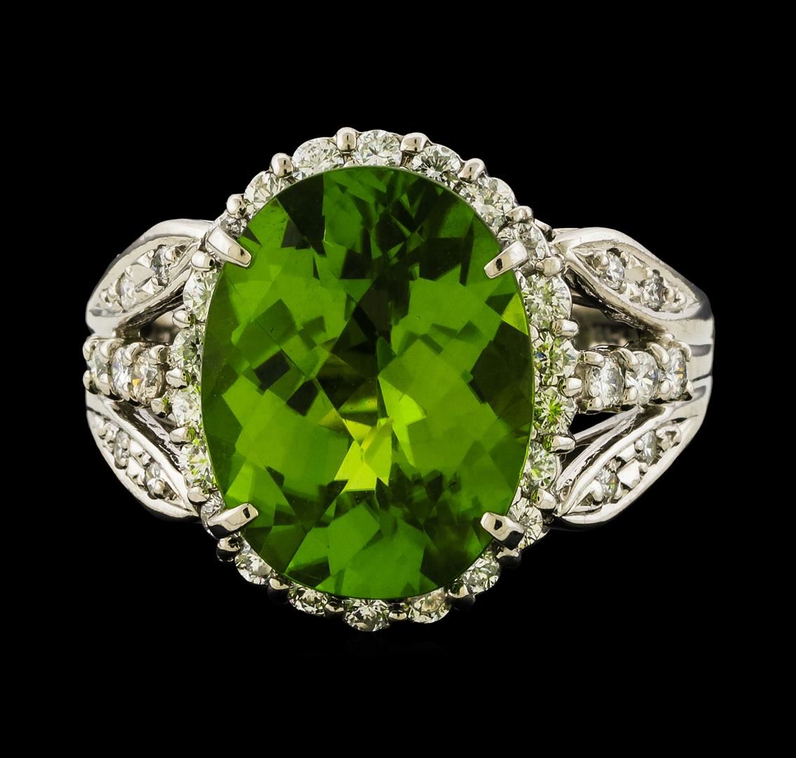 One ring featuring: Platinum containing Peridot with a total weight of 6.64ct and Diamonds with a total weight of 0.64ct. Total Weight of Ring: 10.7 grams.