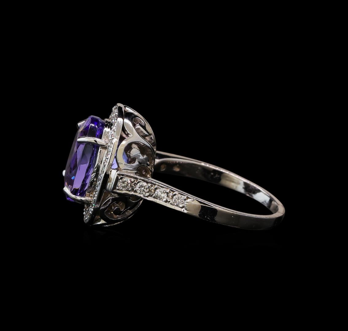 One electronically tested 14KT white gold lady's cast fashion ring with a basket halo with a bright polish finish. The featured lady's ring has a shank measuring 1.68 millimeters wide. Identified with markings of '14K'. Condition is new, good workmanship. Containing: One prong set oval modified brilliant cut natural tanzanite, measuring 11.92 x 9.69 x 7.93mm, (depth est.) 3%. bulge factor, approximate weight of 6.64ct., clarity is eye clean, medium, very slightly grayish, bluish violet color, (GIA bV 5/3), cut is very good. Transmitting light with no distortion, transparent. Colored gemstones are presumed to have been subjected to commonly used enhancement processes. Graded in the setting. Twenty-Six bead set round brilliant cut diamonds, measuring 1.70 - 1.60 x 1.02mm (depth est.) approximate total weight of 26 Stones = 0.45ct. Graded in the setting. Clarity SI-1 to SI-2. Color: G - I Cut Good. Total Weight of Colored Stones 6.64ct.. Total Weight of Diamonds 0.45ct.. Total Weight of Ring 7.10gm GAS Appraised at $12,085.00.
