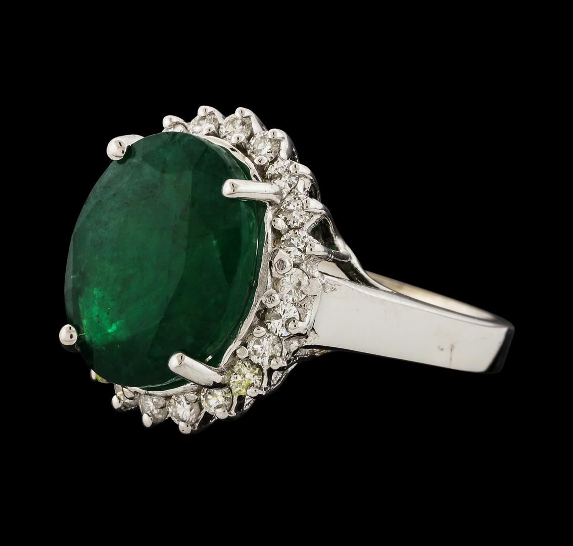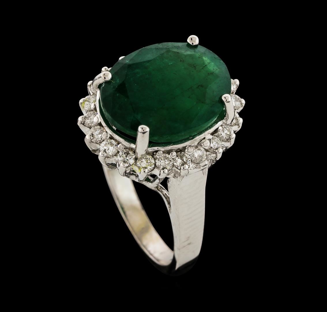 One electronically tested 14KT white gold lady's cast fashion ring with a basket halo with a bright polish finish. The featured lady's ring has a shank measuring 2.54 millimeters wide. Identified with markings of '14K'. Condition is new, good workmanship. Containing: One prong set oval modified mixed cut natural emerald, measuring 13.65 x 10.68 x 6.92mm, (depth est.) 15%. bulge factor, approximate weight of 6.65ct., clarity is heavily included, medium dark, moderately strong, green color, (GIA G 6/4), cut is good. Transmitting light somewhat diffusely, semi-transparent to translucent. Naturally occurring internal & external characteristics are present. Indications of oil residue. Colored gemstones are presumed to have been subjected to commonly used enhancement processes. Graded in the setting. Twenty-Two prong set round brilliant cut diamonds, measuring 1.90 - 1.85 x 1.15mm (depth est.) approximate total weight of 22 Stones = 0.54ct. Graded in the setting. Clarity SI-1 to SI-2. Color: G - H Cut Good. Total Weight of Colored Stones 6.65ct.. Total Weight of Diamonds 0.54ct.. Total Weight of Ring 7.50gm GAS Appraised at $8,070.00.