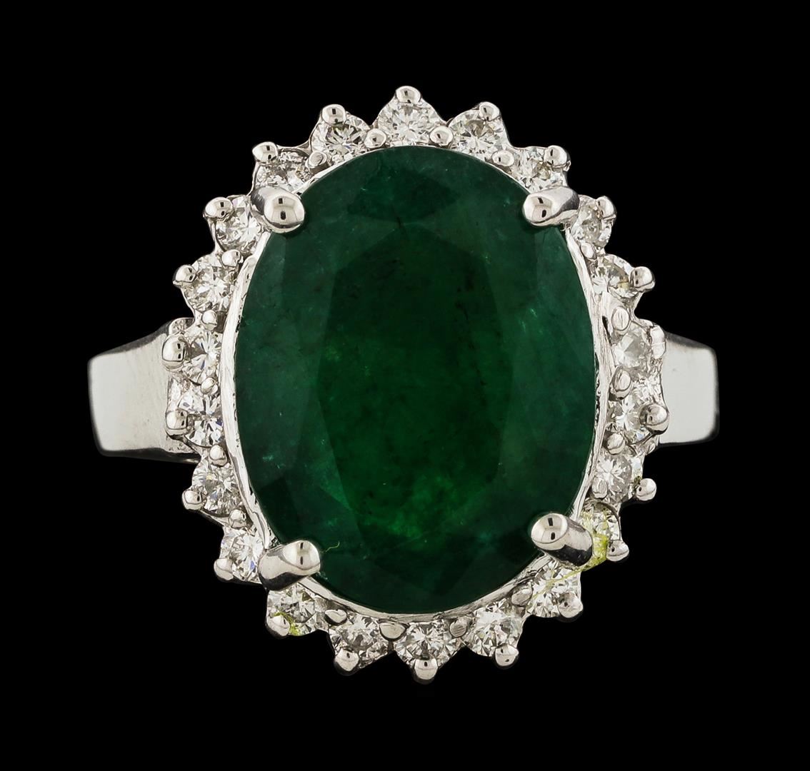 One electronically tested 14KT white gold lady's cast fashion ring with a basket halo with a bright polish finish. The featured lady's ring has a shank measuring 2.54 millimeters wide. Identified with markings of '14K'. Condition is new, good workmanship. Containing: One prong set oval modified mixed cut natural emerald, measuring 13.65 x 10.68 x 6.92mm, (depth est.) 15%. bulge factor, approximate weight of 6.65ct., clarity is heavily included, medium dark, moderately strong, green color, (GIA G 6/4), cut is good. Transmitting light somewhat diffusely, semi-transparent to translucent. Naturally occurring internal & external characteristics are present. Indications of oil residue. Colored gemstones are presumed to have been subjected to commonly used enhancement processes. Graded in the setting. Twenty-Two prong set round brilliant cut diamonds, measuring 1.90 - 1.85 x 1.15mm (depth est.) approximate total weight of 22 Stones = 0.54ct. Graded in the setting. Clarity SI-1 to SI-2. Color: G - H Cut Good. Total Weight of Colored Stones 6.65ct.. Total Weight of Diamonds 0.54ct.. Total Weight of Ring 7.50gm GAS Appraised at $8,070.00.