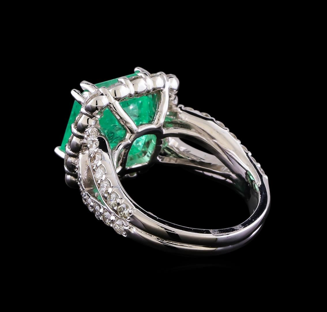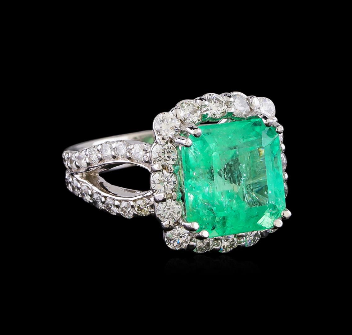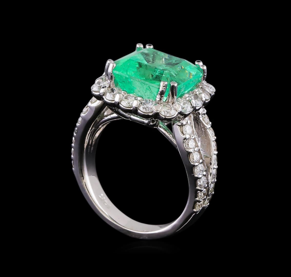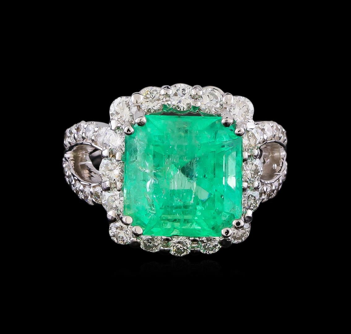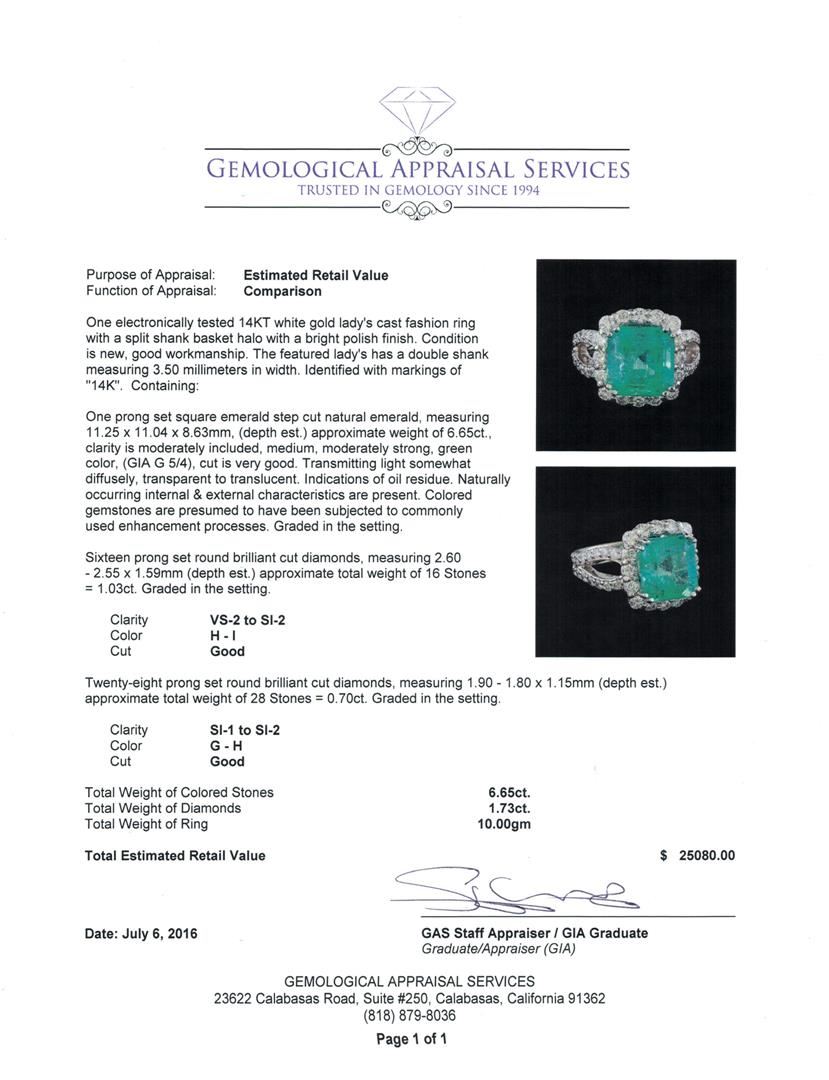 One electronically tested 14KT white gold lady's cast fashion ring with a split shank basket halo with a bright polish finish. The featured lady's has a double shank measuring 3.50 millimeters in width. Identified with markings of "14K". Condition is new, good workmanship. Containing: One prong set square emerald step cut natural emerald, measuring 11.25 x 11.04 x 8.63mm, (depth est.) approximate weight of 6.65ct., clarity is moderately included, medium, moderately strong, green color, (GIA G 5/4), cut is very good. Transmitting light somewhat diffusely, transparent to translucent. Indications of oil residue. Naturally occurring internal & external characteristics are present. Colored gemstones are presumed to have been subjected to commonly used enhancement processes. Graded in the setting. Sixteen prong set round brilliant cut diamonds, measuring 2.60 - 2.55 x 1.59mm (depth est.) approximate total weight of 16 Stones = 1.03ct. Graded in the setting. Clarity: VS-2 to SI-2. Color: H - I. Cut Good Twenty-Eight prong set round brilliant cut diamonds, measuring 1.90 - 1.80 x 1.15mm (depth est.) approximate total weight of 28 Stones = 0.70ct. Graded in the setting. Clarity: SI-1 to SI-2. Color: G - Good. Total Weight of Colored Stones 6.65ct. Total Weight of Diamonds 1.73ct. Total Weight of Ring 10.00gm. GAS Appraised.