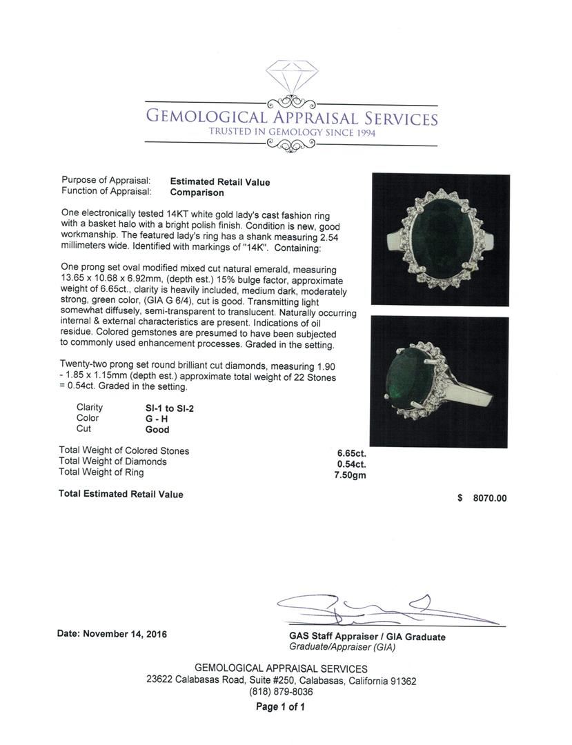 One electronically tested 14KT white gold lady's cast fashion ring with a basket halo with a bright polish finish. The featured lady's ring has a shank measuring 2.54 millimeters wide. Identified with markings of '14K'. Condition is new, good workmanship. Containing: One prong set oval modified mixed cut natural emerald, measuring 13.65 x 10.68 x 6.92mm, (depth est.) 15%. bulge factor, approximate weight of 6.65ct., clarity is heavily included, medium dark, moderately strong, green color, (GIA G 6/4), cut is good. Transmitting light somewhat diffusely, semi-transparent to translucent. Naturally occurring internal & external characteristics are present. Indications of oil residue. Colored gemstones are presumed to have been subjected to commonly used enhancement processes. Graded in the setting. Twenty-Two prong set round brilliant cut diamonds, measuring 1.90 - 1.85 x 1.15mm (depth est.) approximate total weight of 22 Stones = 0.54ct. Graded in the setting. Clarity SI-1 to SI-2. Color: G - H Cut Good. Total Weight of Colored Stones 6.65ct.. Total Weight of Diamonds 0.54ct.. Total Weight of Ring 7.50gm GAS Appraised at $8,070.00.