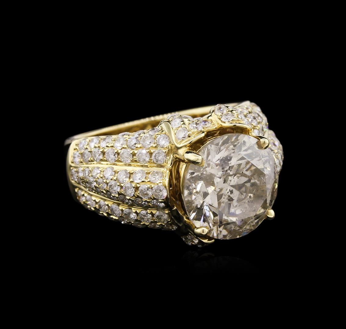 One electronically tested 14KT yellow gold ladies cast diamond unity ring with a bright polish finish. The featured diamond is supported by elaborate diamond set shoulders, completed by a three millimeter wide band. Trademark is RT. Identified with markings of "14K". Condition is new, good workmanship. Containing: One prong set round brilliant cut diamond, measuring 10.75 - 10.74 x 6.60mm (depth est.), 6.00.%. GTCF approximate weight of 5.08ct with a strong blue fluorescence. Graded in the setting. Clarity: I-2. Depth: 61.4%. Table 56.7%. One Hundred Thirty-Four bead set round brilliant cut diamonds approximate total weight of 134 Stones = 1.58ct. Graded in the setting. Clarity: I-1 to I-2. Color: G - I. Total Weight of Diamonds 6.66ct. Total Weight of Ring 8.25gm. AIG Appraised at $42,225.00.