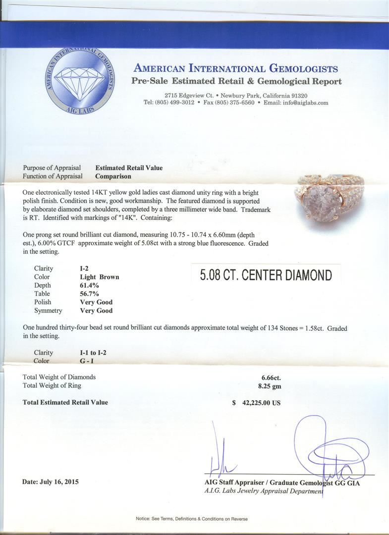 One electronically tested 14KT yellow gold ladies cast diamond unity ring with a bright polish finish. The featured diamond is supported by elaborate diamond set shoulders, completed by a three millimeter wide band. Trademark is RT. Identified with markings of "14K". Condition is new, good workmanship. Containing: One prong set round brilliant cut diamond, measuring 10.75 - 10.74 x 6.60mm (depth est.), 6.00.%. GTCF approximate weight of 5.08ct with a strong blue fluorescence. Graded in the setting. Clarity: I-2. Depth: 61.4%. Table 56.7%. One Hundred Thirty-Four bead set round brilliant cut diamonds approximate total weight of 134 Stones = 1.58ct. Graded in the setting. Clarity: I-1 to I-2. Color: G - I. Total Weight of Diamonds 6.66ct. Total Weight of Ring 8.25gm. AIG Appraised at $42,225.00.