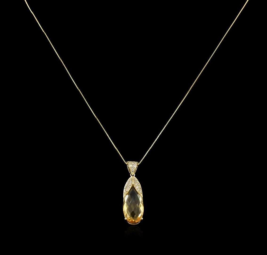 One pendant with chain featuring: 14KT yellow gold weighing 4.90 grams containing one citrine center stone with a total weight of 6.66ct and diamonds with a total weight of 0.33ct.