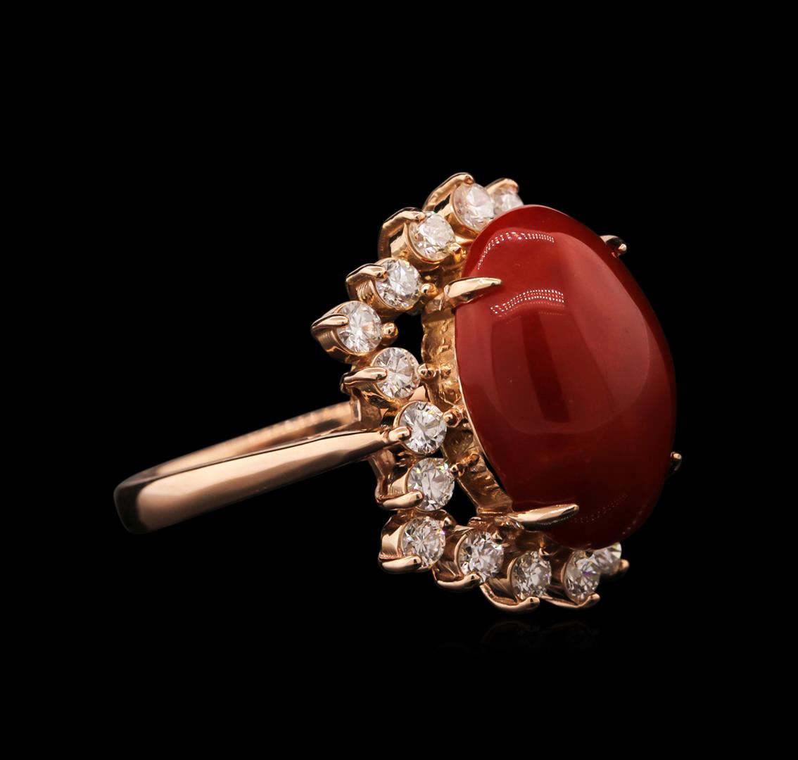 One ring featuring: 14KT rose gold weighing 4.83 grams containing one coral center stone with a total weight of 6.67ct and 20 diamonds with a total weight of 0.91ct.