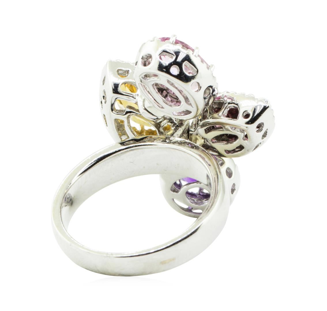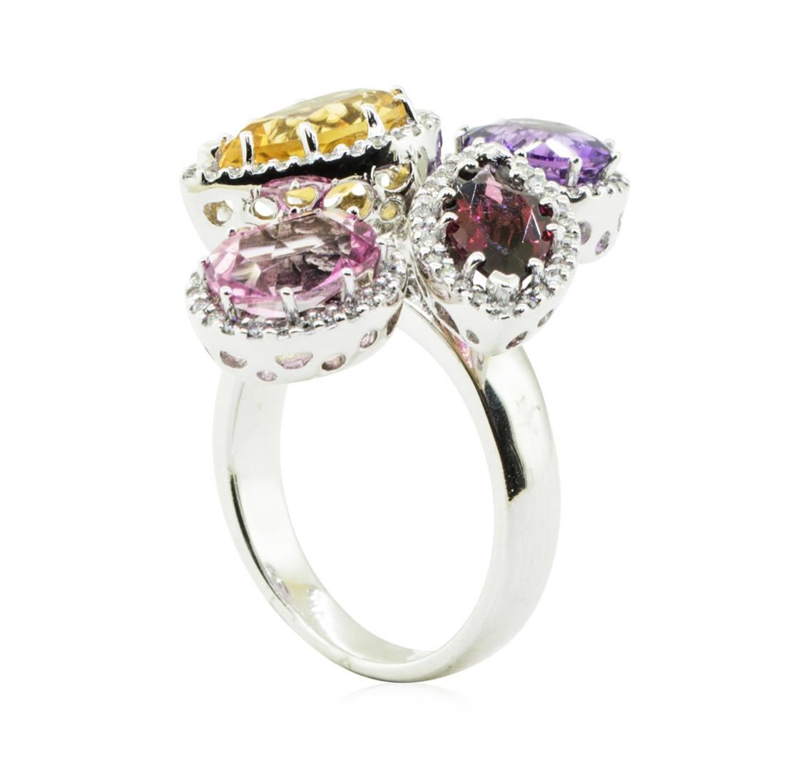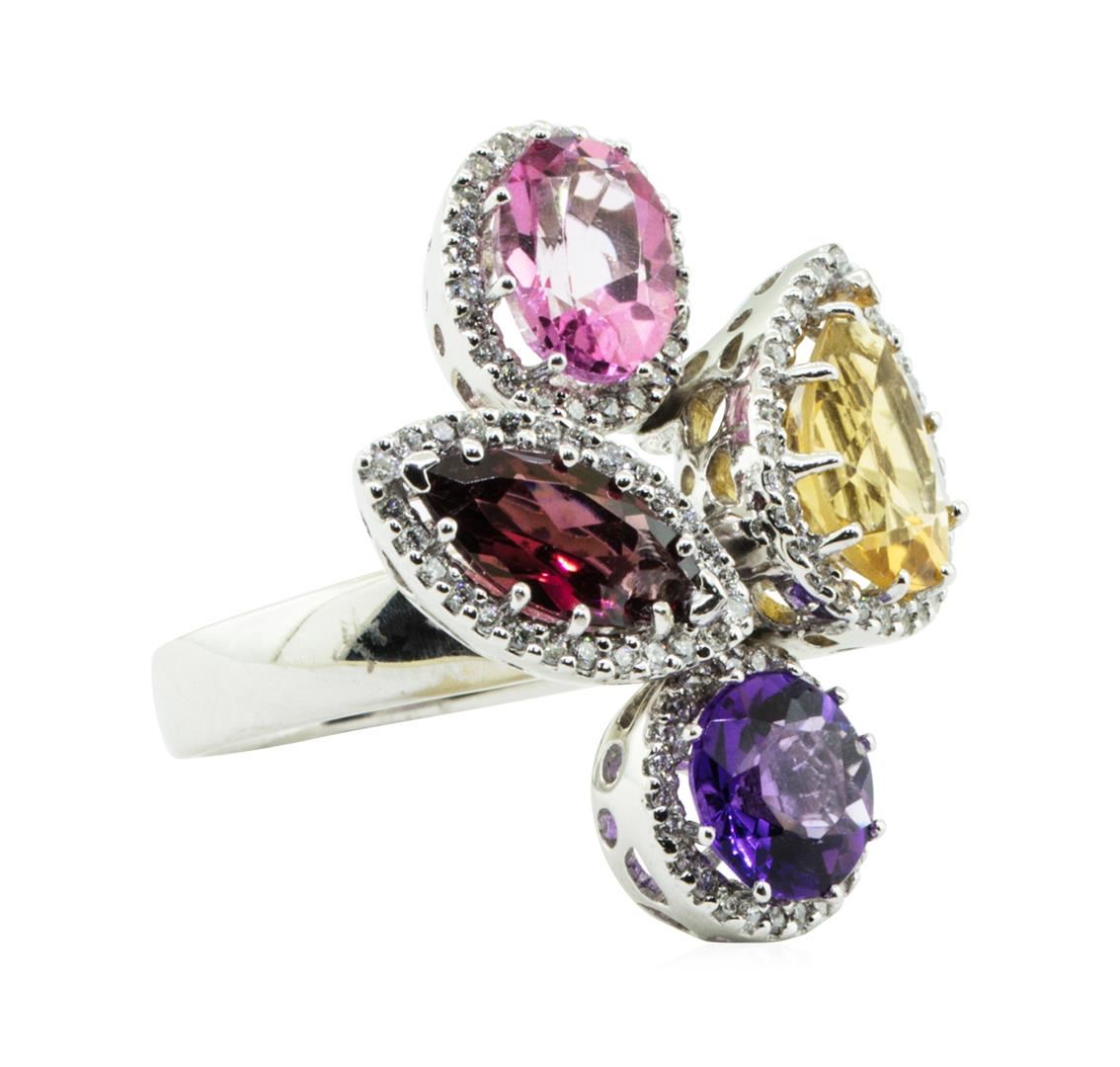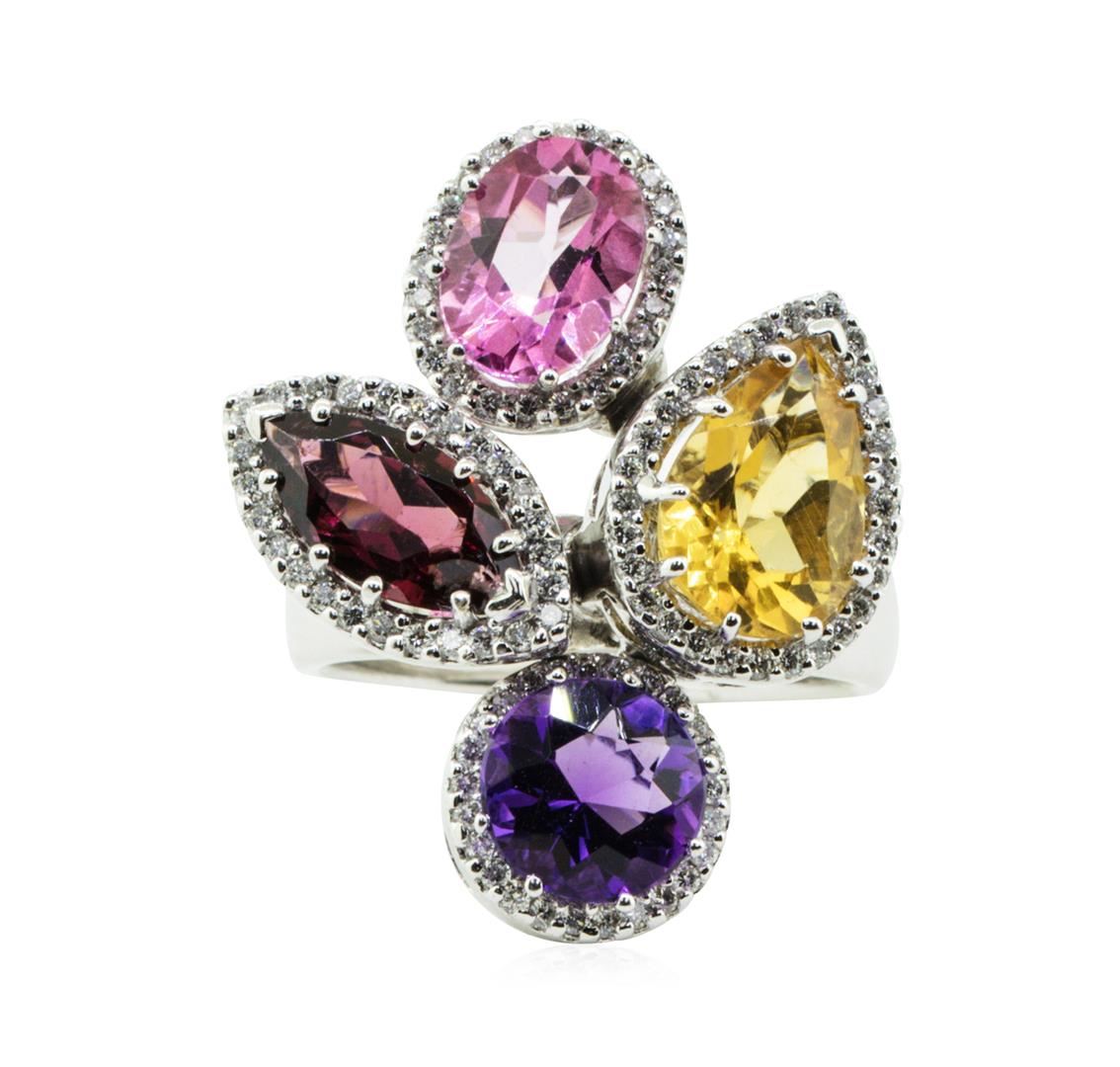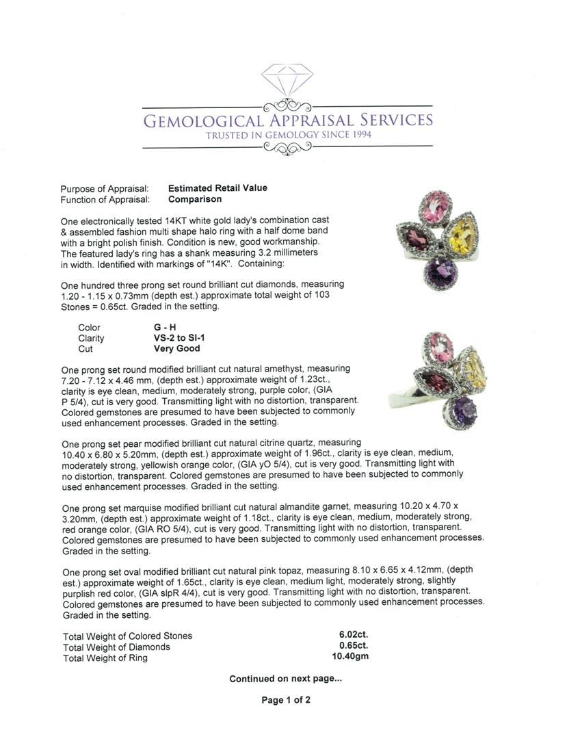 One electronically tested 14KT white gold lady's combination cast & assembled fashion multi shape halo ring with a half dome band with a bright polish finish. The featured lady's ring has a shank measuring 3.2 millimeters in width. Identified with markings of '14K'. Condition is new, good workmanship. Containing: One Hundred Three prong set round brilliant cut diamonds, measuring 1.20 - 1.15 x 0.73mm (depth est.) approximate total weight of 103 Stones = 0.65ct. Graded in the setting. Color G - H Clarity VS-2 to SI-1 Cut Very Good One prong set round modified brilliant cut natural amethyst, measuring 7.20 - 7.12 x 4.46 mm, (depth est.) approximate weight of 1.23ct., clarity is eye clean, medium, moderately strong, purple color, (GIA P 5/4), cut is very good. Transmitting light with no distortion, transparent. Colored gemstones are presumed to have been subjected to commonly used enhancement processes. Graded in the setting. One prong set pear modified brilliant cut natural citrine quartz, measuring 10.40 x 6.80 x 5.20mm, (depth est.) approximate weight of 1.96ct., clarity is eye clean, medium, moderately strong, yellowish orange color, (GIA yO 5/4), cut is very good. Transmitting light with no distortion, transparent. Colored gemstones are presumed to have been subjected to commonly used enhancement processes. Graded in the setting. One prong set marquise modified brilliant cut natural almandite garnet, measuring 10.20 x 4.70 x 3.20mm, (depth est.) approximate weight of 1.18ct., clarity is eye clean, medium, moderately strong, red orange color, (GIA RO 5/4), cut is very good. Transmitting light with no distortion, transparent. Colored gemstones are presumed to have been subjected to commonly used enhancement processes. Graded in the setting. One prong set oval modified brilliant cut natural pink topaz, measuring 8.10 x 6.65 x 4.12mm, (depth est.) approximate weight of 1.65ct., clarity is eye clean, medium light, moderately strong, slightly purplish red color, (GIA slpR 4/4), cut is very good. Transmitting light with no distortion, transparent. Colored gemstones are presumed to have been subjected to commonly used enhancement processes. Graded in the setting. Total Weight of Colored Stones 6.02ct.. Total Weight of Diamonds 0.65ct.. Total Weight of Ring 10.40gm GAS Appraised at $4830.00. GAS Appraised.