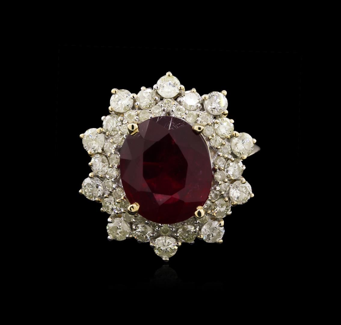 Fourteen karat (14K) yellow gold ruby and diamond ring. An oval cut ruby corundum gemstone is prong mounted in the center of the ring. Round brilliant cut diamonds accent the ring around the center gemstone. The ring is cast stamped "14K" and has a gross weight of 6.3 Grams. Diamond(s): Shape: Round Brilliant Cut. Weight: 1.71 carat. Average Clarity: I1-I2. Average Color: I-K. Symmetry: Very Good. Polish: Very Good. Gemstone(s): GemStone: Ruby Corundum. Nature: Natural. Shape: Oval, Faceted. Quantity: 1, Mounted. Weight 6.67 carat. Dimensions: Length-12.07 mm. ; Width- 10.20 mm. Bulge: Visible. Clarity: I1, Type 3. Color: Red (5/5). Symmetry: Very Good. Color Intensity: Medium. Transparency: Transparent. Tone: Dark. Enhancements: Indications of high temperature heat treatment, with glass and flux additives. Metal(s): Metal: Gold, Stamped. Purity: 14K. Color: Yellow. Condition: Excellent. Finish: High polish. GGA Appraised.