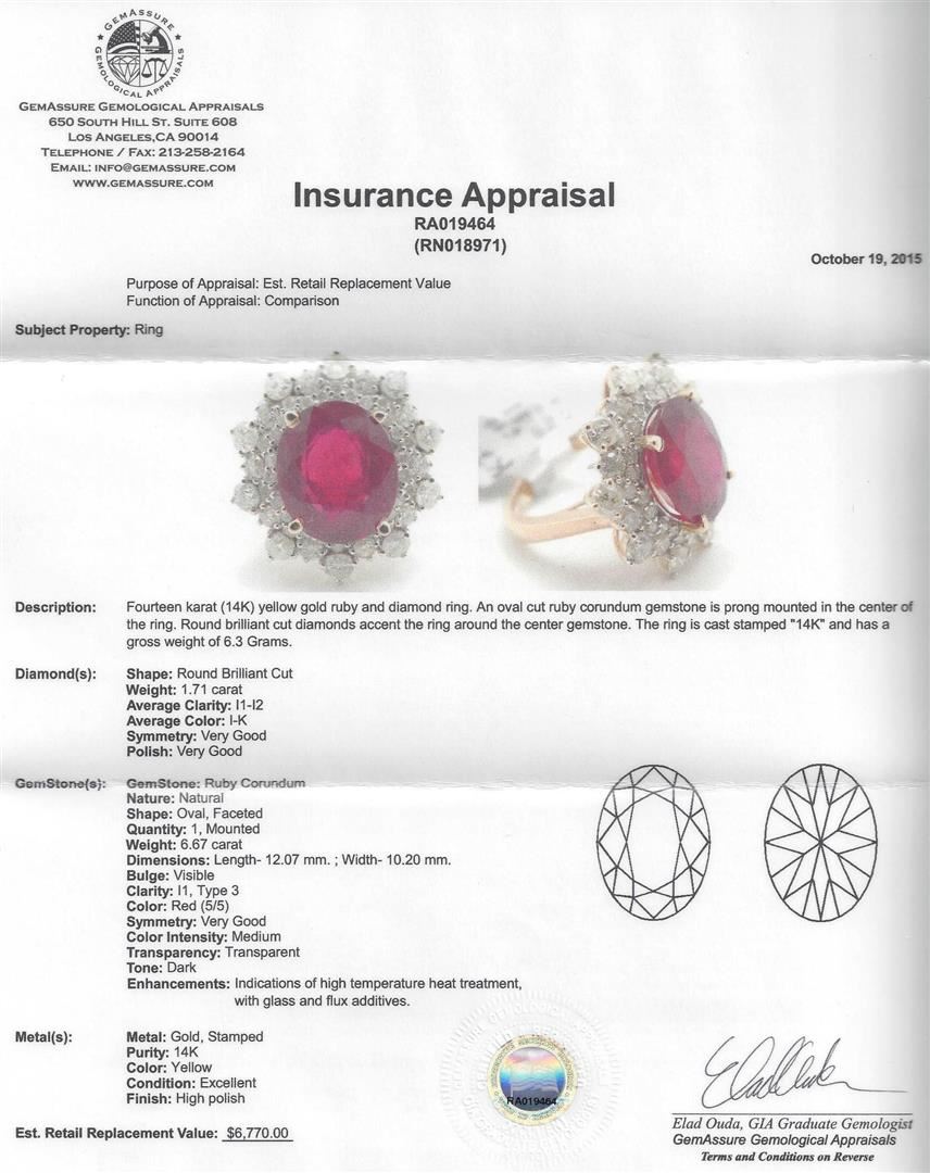 Fourteen karat (14K) yellow gold ruby and diamond ring. An oval cut ruby corundum gemstone is prong mounted in the center of the ring. Round brilliant cut diamonds accent the ring around the center gemstone. The ring is cast stamped "14K" and has a gross GGA Appraised.
