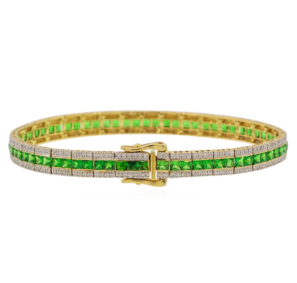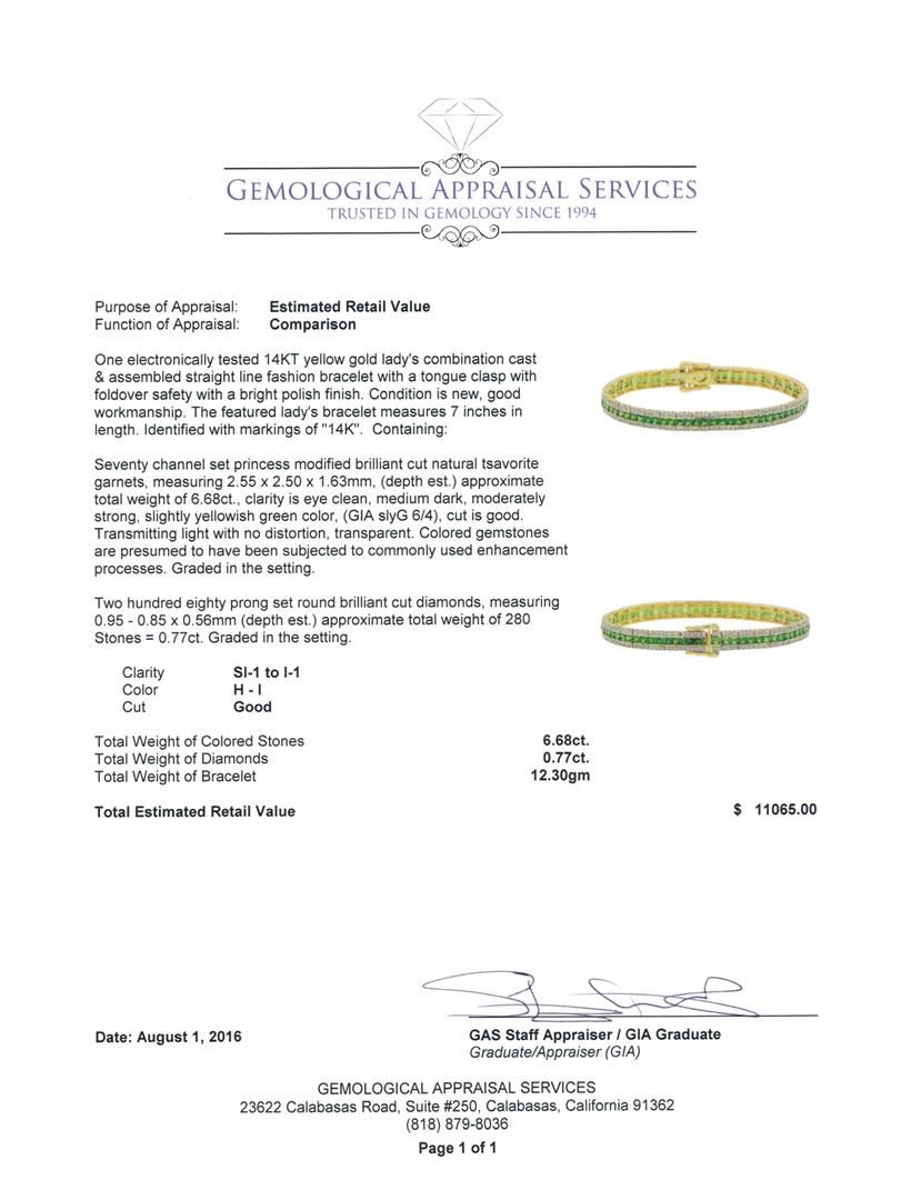 One electronically tested 14KT yellow gold lady's combination cast & assembled straight line fashion bracelet with a tongue clasp with foldover safety with a bright polish finish. The featured lady's bracelet measures 7 inches in length. Identified with markings of '14K'. Condition is new, good workmanship. Containing: Seventy channel set princess modified brilliant cut natural tsavorite garnets, measuring 2.55 x 2.50 x 1.63mm, (depth est.) approximate total weight of 6.68ct., clarity is eye clean, medium dark, moderately strong, slightly yellowish green color, (GIA slyG 6/4), cut is good. Transmitting light with no distortion, transparent. Colored gemstones are presumed to have been subjected to commonly used enhancement processes. Graded in the setting. Two Hundred Eighty prong set round brilliant cut diamonds, measuring 0.95 - 0.85 x 0.56mm (depth est.) approximate total weight of 280 Stones = 0.77ct. Graded in the setting. Clarity SI-1 to I-1. Color: H - I Cut Good. Total Weight of Colored Stones 6.68ct.. Total Weight of Diamonds 0.77ct.. Total Weight of Bracelet 12.30gm. GAS Appraised at $11,065.00.