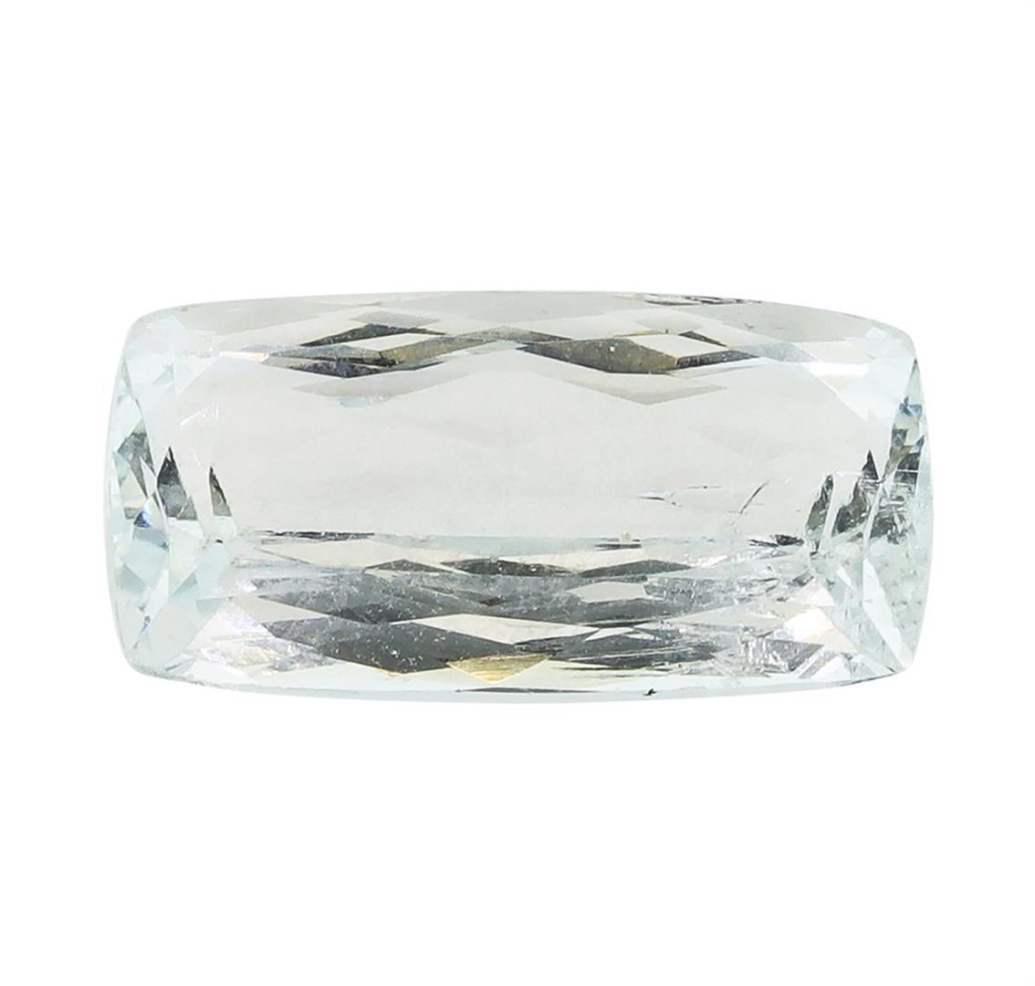 One natural cushion cut aquamarine with an exact weight of 6.69ct., clarity is slightly included, slightly grayish greenish blue, medium light. Gemological Appraisals Services estimates the retail value at $2575.65 GAS Appraised.