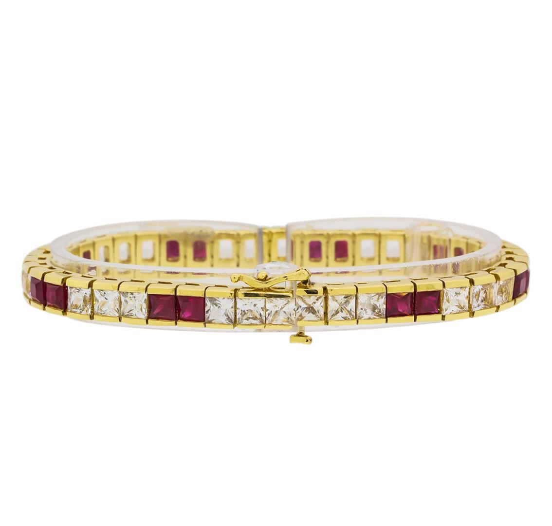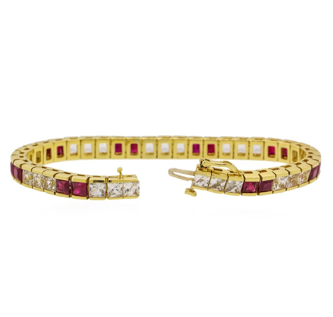 One electronically tested 14KT yellow gold lady's combination cast & assembled straight line tennis bracelet with a tongue clasp with foldover safety with a bright polish finish. The featured lady's bracelet measures 7 inches in length. Identified with markings of '14K'. Condition is new, good workmanship. Containing: Twenty-seven channel set princess modified brilliant cut natural white sapphires, measuring 4.10 x 4.00 x 2.61mm, (depth est.) approximate total weight of 11.42ct., clarity is eye clean, colorless, very slightly grayish, white color, (GIA W 0/3), cut is very good. Transmitting light with no distortion, transparent. Colored gemstones are presumed to have been subjected to commonly used enhancement processes. Graded in the setting. Sixteen channel set princess modified brilliant cut natural rubies, measuring 4.00 x 3.90 x 2.54mm, (depth est.) approximate total weight of 6.69ct., clarity is moderately included, medium dark, moderately strong, red color, (GIA R 6/4), cut is very good. Transmitting light somewhat diffusely, transparent to translucent. Colored gemstones are presumed to have been subjected to commonly used enhancement processes. Graded in the setting. Total Weight of Colored Stones 18.11ct.. Total Weight of Bracelet 27.90gm. GAS Appraised at $15,695.00.