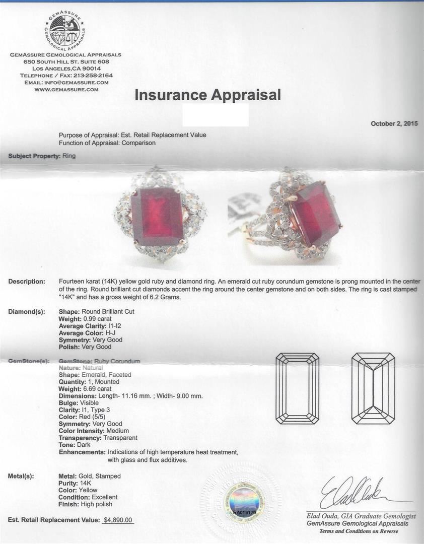 Fourteen karat (14K) yellow gold ruby and diamond ring. An emerald cut ruby corundum gemstone is prong mounted in the center of the ring. Round brilliant cut diamonds accent the ring around the center gemstone and on both sides. The ring is cast stamped "14K" and has a gross weight of 6.2 Grams. Diamond(s): Shape: Round Brilliant Cut. Weight: 0.99 carat. Average Clarity: I1-I2. Average Color: H-J. Symmetry: Very Good. Polish: Very Good. Gemstone(s): GemStone: Ruby Corundum. Nature: Natural. Shape: Emerald, Faceted. Quantity: 1, Mounted. Weight 6.69 carat. Dimensions: Length-11.16 mm. ; Width- 9.00 mm. Bulge: Visible. Clarity: I1, Type 3. Color: Red (5/5). Symmetry: Very Good. Color Intensity: Medium. Transparency: Transparent. Tone: Dark. Enhancements: Indications of high temperature heat treatment, with glass and flux additives. Metal(s): Metal: Gold, Stamped. Purity: 14K. Color: Yellow. Condition: Excellent. Finish: High polish. GGA Appraised.