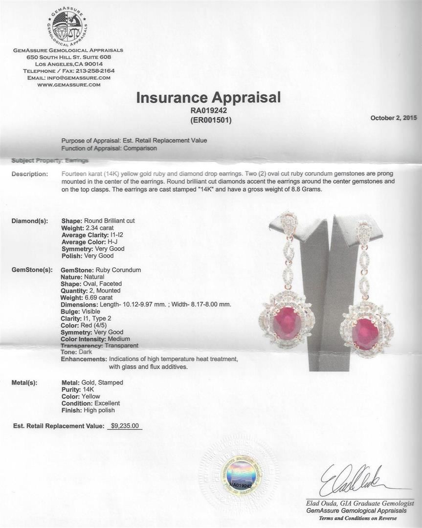 Fourteen karat (14K) yellow gold ruby and diamond drop earrings. Two (2) oval cut ruby corundum gemstones are prong mounted in the center of the earrings. Round brilliant cut diamonds accent the earrings around the center gemstones and on the top clasps. GGA Appraised.