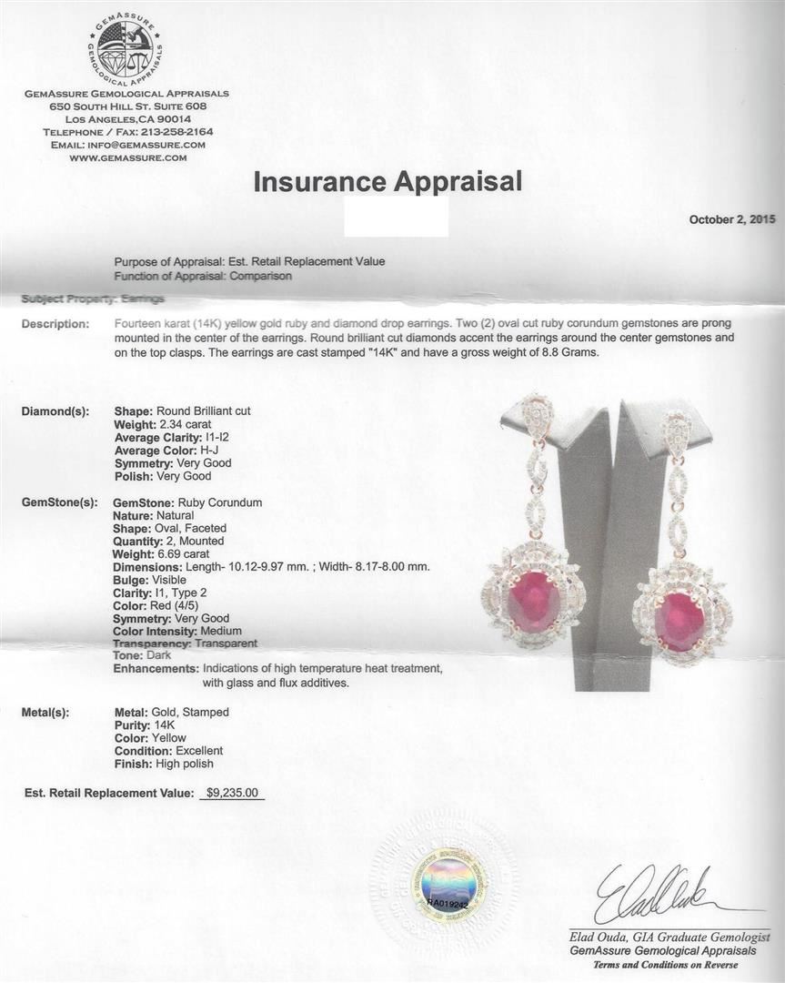 Fourteen karat (14K) yellow gold ruby and diamond drop earrings. Two (2) oval cut ruby corundum gemstones are prong mounted in the center of the earrings. Round brilliant cut diamonds accent the earrings around the center gemstones and on the top clasps. The earrings are cast stamped "14K" and has a gross weight of 8.8 Grams. Diamond(s): Shape: Round Brilliant Cut. Weight: 2.34 carat. Average Clarity: I1-I2. Average Color: H-J. Symmetry: Very Good. Polish: Very Good. Gemstone(s): GemStone: Ruby Corundum. Nature: Natural. Shape: Oval, Faceted. Quantity: 2, Mounted. Weight: 6.69 carat. Dimensions: Length-10.12-9.97 mm. ; Width- 8.17-8.00 mm. Bulge: Visible. Clarity: I1, Type 2. Color: Red (4/5). Symmetry: Very Good. Color Intensity: Medium. Transparency: Transparent. Tone: Dark. Enhancements: Indications of high temperature heat treatment, with glass and flux additives. Metal(s): Metal: Gold, Stamped. Purity: 14K. Color: Yellow. Condition: Excellent. Finish: High polish. GGA Appraised.
